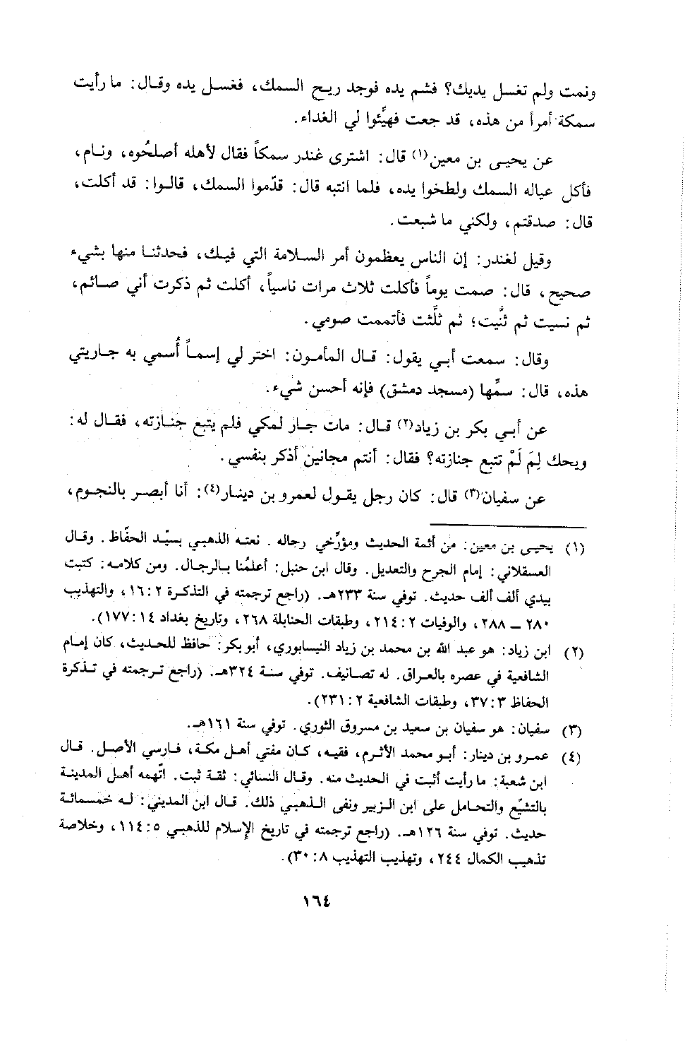عن يحيى بن معين قال: اشترى غندر سمكاً فقال لأهله: أصلحوه، ونام، فأكل عياله السمك ولطخوا يده به، فلما انتبه قال: قدموا السمك، قالوا: قد أكلت، قال: صدقتم ولكني ما شبعت.