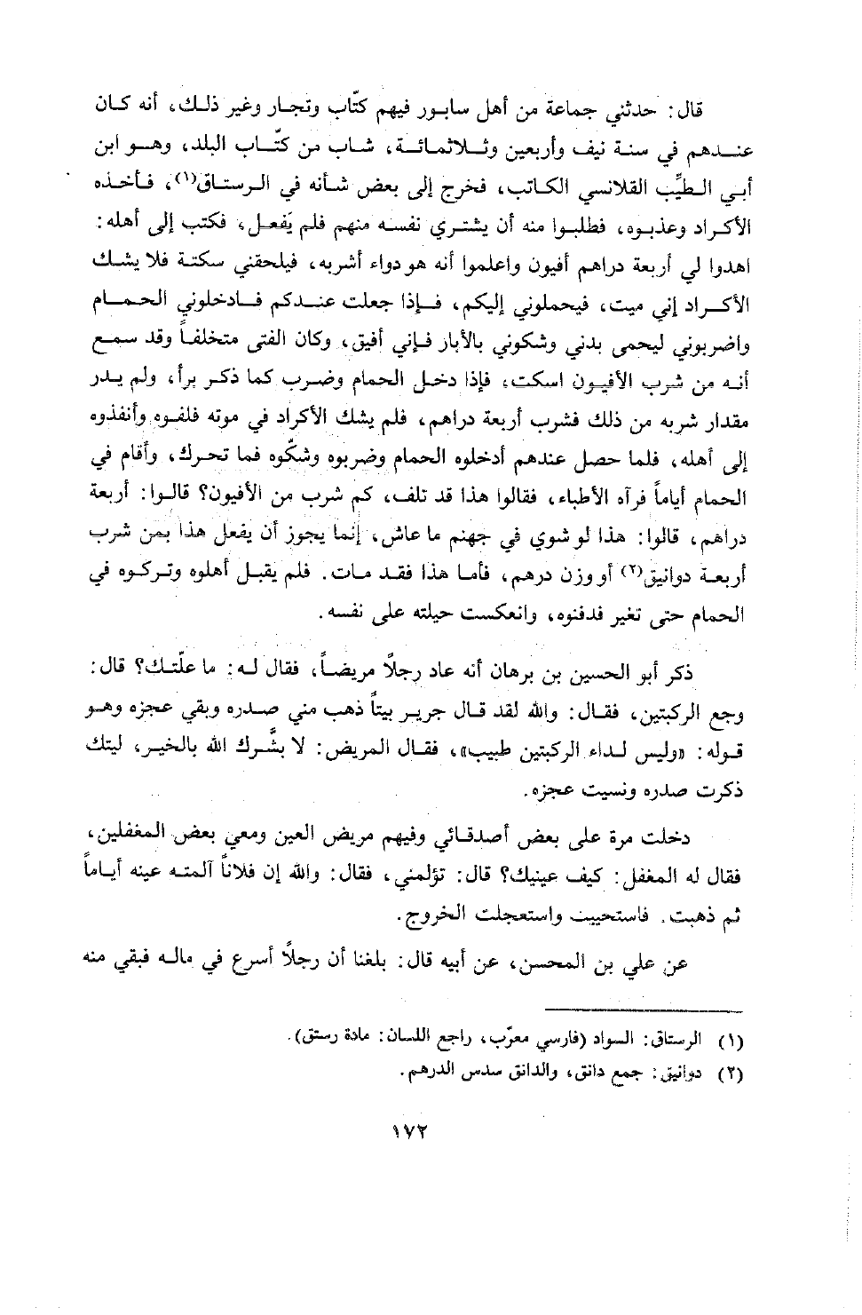 قال: حدثني جماعة من أهل سابور فيهم كتاب وتجار وغير ذلك، أنه كان عندهم في سنة نيف وأربعين وثلاثمائة، شاب من كتاب البلد، وهو ابن أبي الطيب القلانسي الكاتب، فخرج إلى بعض شأنه من الرستاق، فأخذه الأكراد وعذبوه، فطلبوا منه أن يشتري نفسه منهم فلم يفعل، فكتب إلى أهله: اهدوا لي أربعة دراهم أفيون واعلموا أنه هو دواء أشربه، فيلحقني سكتة فلا يشك الأكراد أني ميت، فيحملوني إليكم، فإذا جعلت عندكم فأدخلوني الحمام واضربوني ليحمى بدني وشكوني بالإبار فإني أفيق، وكان الفتى متخلفاً وقد سمع أنه من شرب الأفيون اسكت، فإذا دخل الحمام وضرب كما ذكر برأ، ولم يدر مقدار شربه من ذلك فشرب أربعة دراهم، فلم يشك الأكراد في موته فلفوه وأنفذوه إلى أهله، فلما حصل عندهم أدخلوه الحمام ضربوه وشكوه فما تحرك، وأقام في الحمام أياماً فرآه الأطباء فقالوا: هذا قد تلف، كم شرب من الأفيون! قالوا: أربعة دراهم، فقالوا: هذا لو شوي في جهنم ما عاش، إنما يجوز أن يفعل هذا بمن شرب أربعة دوانيق أو وزن درهم، فأما هذا فقد مات. فلم يقبل أهلوه وتركوه في الحمام حتى تغير فدفنوه، وانعكست حيلته على نفسه.