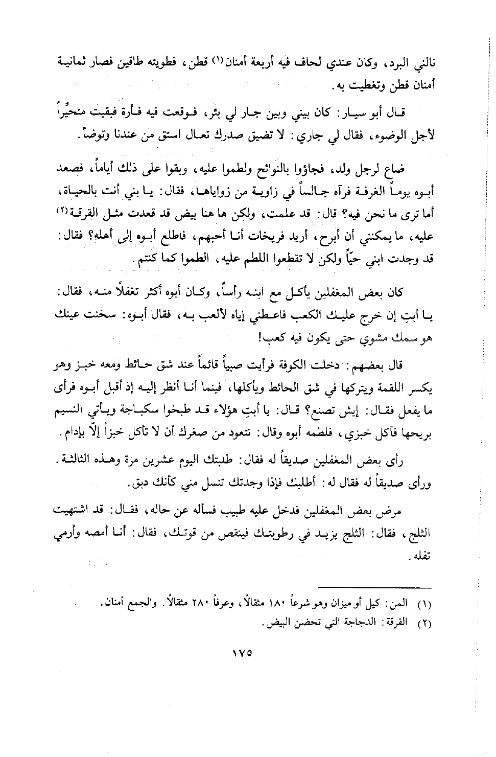 نالني البرد، وكان عندي لحاف فيه أربعة أمنان قطن، فطويته طاقين فصار ثمانية أمنان قطن وتغطيت به.