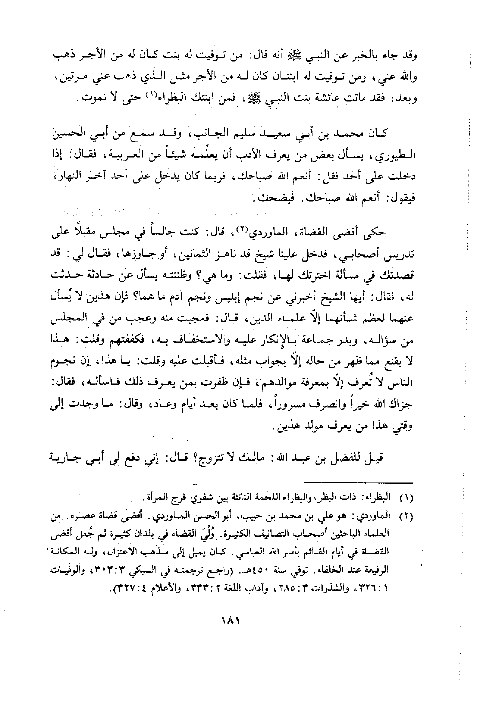 حكى أقضى القضاة الماوردي قال: كنت جالساً في مجلس مقبلاً على تدريس أصحابي، فدخل علينا شيخ قد ناهز الثمانين أو جاوزها فقال لي: قد قصدتك في مسألة اخترتك لها، فقلت: وما هي! وظننته يسأل عن حادثة حدثت له، فقال: أيها الشيخ أخبرني عن نجم إبليس ونجم آدم ما هما، فإن هذين لا يسأل عنهما لعظم شأنهما إلا علماء الدين، قال: فعجبت منه وعجب من في المجلس من سؤاله، وبدر جماعة بالإنكار عليه والإستخفاف به، فكففتهم عنه وقلت: هذا لا يقنع مما ظهر من حاله إلا بجواب مثله، فأقبلت عليه وقلت: يا هذا إن نجوم الناس لا تعرف إلا بمعرفة موالدهم، فإن ظفرت بمن يعرف ذلك فاسأله، فقال: جزاك الله خيراً. وانصرف مسروراًن فلما كان بعد أيام عاد وقال: ما وجدت إلى وقتي هذا من يعرف مولد هذين.