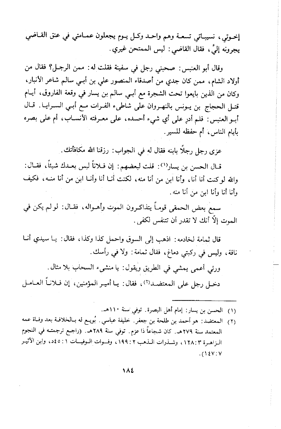 وقال أبو العنبس: صحبني رجل في سفينة فقلت له: ممن الرجل؟ فقال: من أولاد الشام، ممن كان جدي من أصدقاء المنصور علي بن أبي سالم شاعر الأنبار، وكان من الذين بايعوا تحت الشجرة مع أبي سالم بن يسار في وقعة الفاروق، أيام قتل الحجاج بن يونس بالنهروان على شاطىء الفرات مع أبي السرايا، قال أبو العنبس: فلم أدر على أي شيء أحسده، على معرفته بالأنساب، أم على بصره بأيام الناس، أم حفظه للسير.
