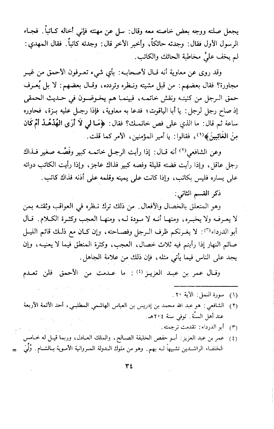 ذكر القسم الثاني: وهو المتعلق بالخصال والأفعال. من ذلك ترك نظره في العواقب وثقته بمن لا يعرفه ولا يخبره، ومنها، أنه لا مودة له.