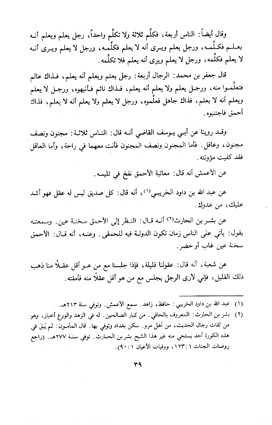 عن عبد الله بن داود الحربي أنه قال: كل صديق ليس له عقل فهو أشد عليك، من عدوك. عن بشر بن الحارث أنه قال: النظر إلى الأحمق سخنة عين. وسمعته يقول: يأتي على الناس زمان تكون الدولة فيه للحمقى. وعنه أنه قال: الأحمق سخنة عين غاب أو حضر.