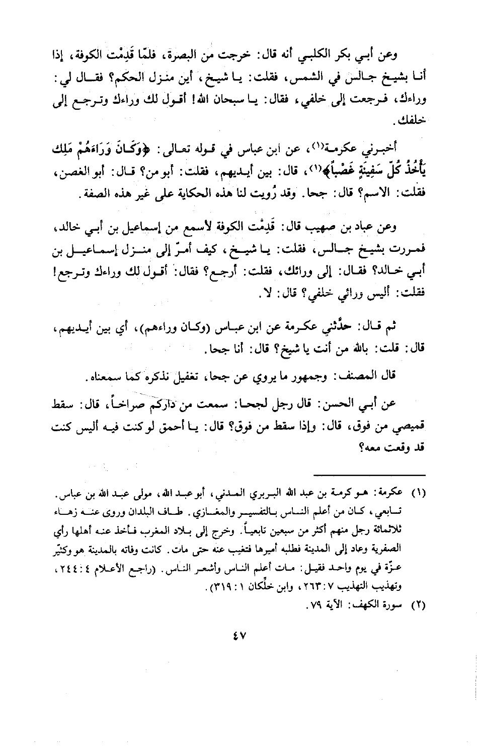 وعن أبي بكر الكلبي أنه قال: خرجت من البصرة فلما قدمت الكوفة، إذا أنا بشيخ جالس في الشمس، فقلت: يا شيخ أين منزل الحكم؟ فقال لي: وراءك، فرجعت إلى خلفي، فقال: يا سبحان الله! أقول لك وراءك وترجل إلى خلفك. أخبرني عكرمة عن ابن عباس في قوله تعالى: " وكان وراءهم ملك يأخذ كل سفينةٍ غصباً " قال: بين أيديهم، فقلت: أبو من؟ قال: أبو الغصن، فقلت: الإسم؟ قال: جحا. وقد رويت لنا هذه الحكاية على غير هذه الصفة. وعن عباد بن صهيب قال: قدمت الكوفة لأسمع من إسماعيل بن خالد، فمررت بشيخ جالس فقلت: يا شيخ، كيف أمر إلى منزل إسماعيل بن خالد؟ فقال: إلى ورائك، فقلت: أرجع؟ فقال: أقول لك وراءك وترجع! فقلت: أليس ورائي خلفي؟ قال: لا. قلت: بالله من أنت يا شيخ؟ قال: أنا جحا، قال المصنف: وجمهور ما يروى عن جحا، تغفيل نذكره كما سمعناه.