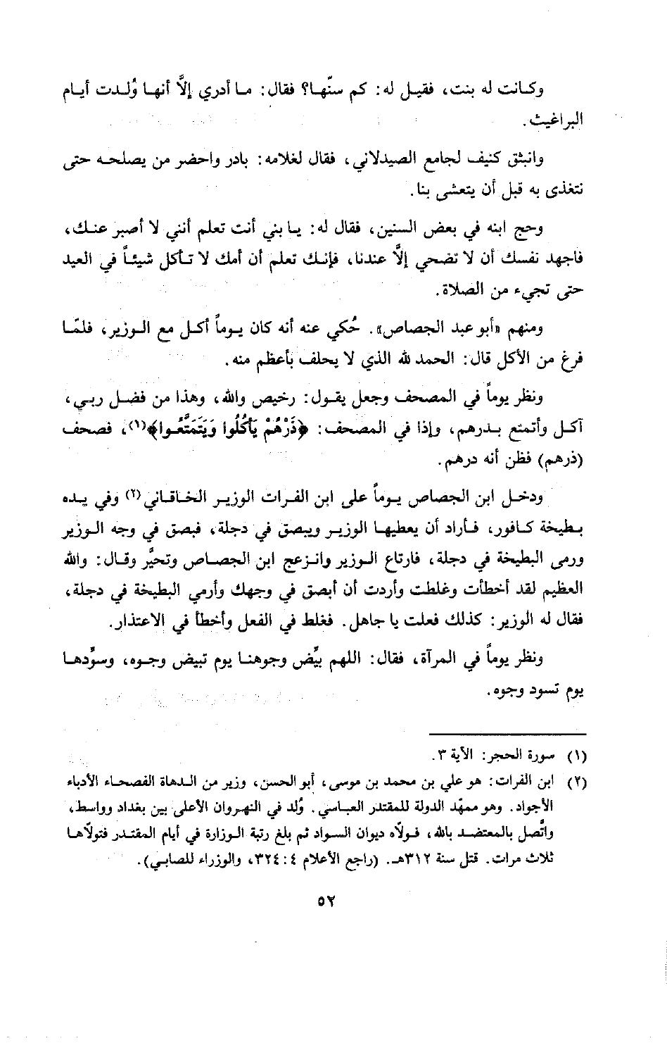 ومنهم أبو عبد الله الجصاص. حكي عنه أنه كان يوماً يأكل مع الوزير، فلما فرغ من الأكل قال: الحمد لله الذي لا يحلف بأعظم منه. ونظر يوماً في المصحف وجعل يقول: رخيص والله، وهذا من فضل ربي، آكل وأتمتع بدرهم، وإذا في المصحف " ذرهم يأكلوا ويتمتعوا " فصحف ذرهم فظن أنه درهم.