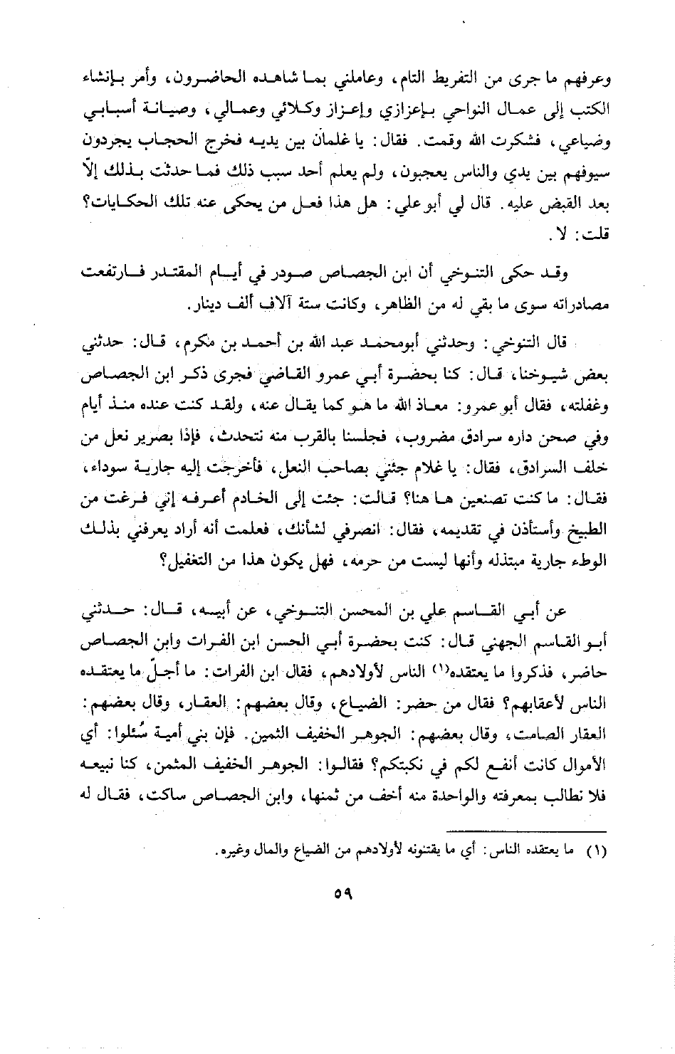 عن أبي القاسم علي بن المحسن التنوخي عن أبيه، قال: حدثني أبو القاسم الجهني، قال: كنت بحضرة أبي الحسن بن الفرات وابن الجصاص حاضر، فذكروا ما يعتقده الناس لأولادهم، فقال ابن الفرات: ما أجل ما يعتقده الناس لأعقابهم فقال من حضر: الضياع، وقال بعضهم: العقار، وقال بعضهم: العقار الصامت، وقال بعضهم: الجوهر الخفيف الثمين. فإن بني أمية سئلوا أي الأموال كانت أنفع لكم في نكبتكم؟ فقالوا: الجوهر الخفيف المثمن كنا نبيعه فلا نطالب بمعرفته، والواحدة منه أخف من ثمنها، وابن الجصاص ساكت، فقال له