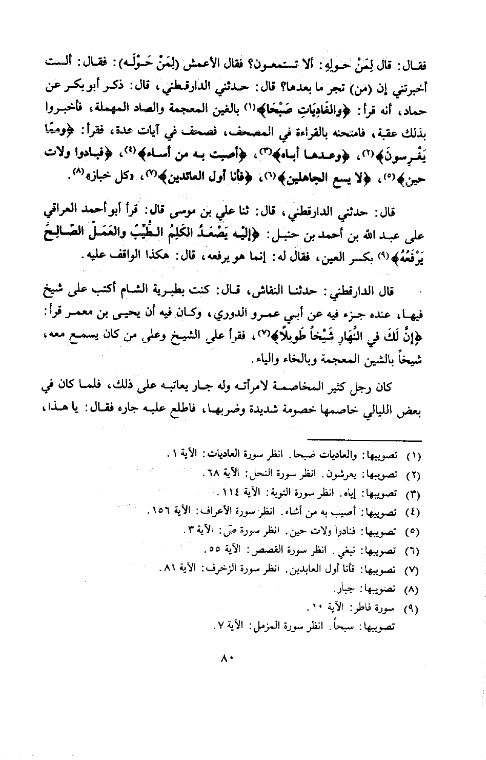 قال: حدثني الدراقطني قال: ذكر أبو بكر عن حماد أن قرأ والغاديات صبحا بالغين المعجمة والصاد المهملة فأخبروا بذلك عقبة فامتحنه بالقراءة في المصحف فصحف في آيات عدة فقرأ ومما يغرسون وعدها أباه أصبت من أساء، فبادوا ولات حين، لا يسع الجاهلين، فأنا أول العائدين. كل خباز. قال: حدثني الدارقطني قال: ثنا علي بن موسى قال: قرأ أبو أحمد العراقي على عبد الله بن أحمد بن حنبل " إليه يصعد الكلم الطيب والعمل الصالح يرفعه " بكسر العين فقال له إنما هو " يرفعه " قال: هكذا الوقف عليه. قال الدارقطني: حدثنا النقاش قال: كنت بطبرية الشام أكتب على شيخ فيها عنده جزء فيه عن أبي عمرو الدوري وكان فيه أن يحيى بن معمر قرأ إن لك في النهار شيخاً طويلاً فقرأ على الشيخ وعلى من كان يسمع معه شيخاً بالشين المعجمة وبالخاء والياء.
