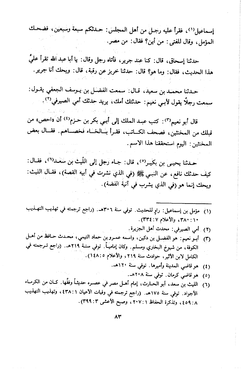 إسماعيل فقرأ عليه رجل من أهل المجلس: حدثكم سبعة وسبعين، فضحك المؤمل وقال للفتى: من أين؟ فقال: من مصر. حدثنا إسحاق قال: كنا عند جرير، فأتاه رجل وقال: يا أبا عبد الله تقرأ علي هذا الحديث، فقال: وما هو؟ قال: حدثنا خربز عن رقبة، قال: ويحك أنا جرير.
