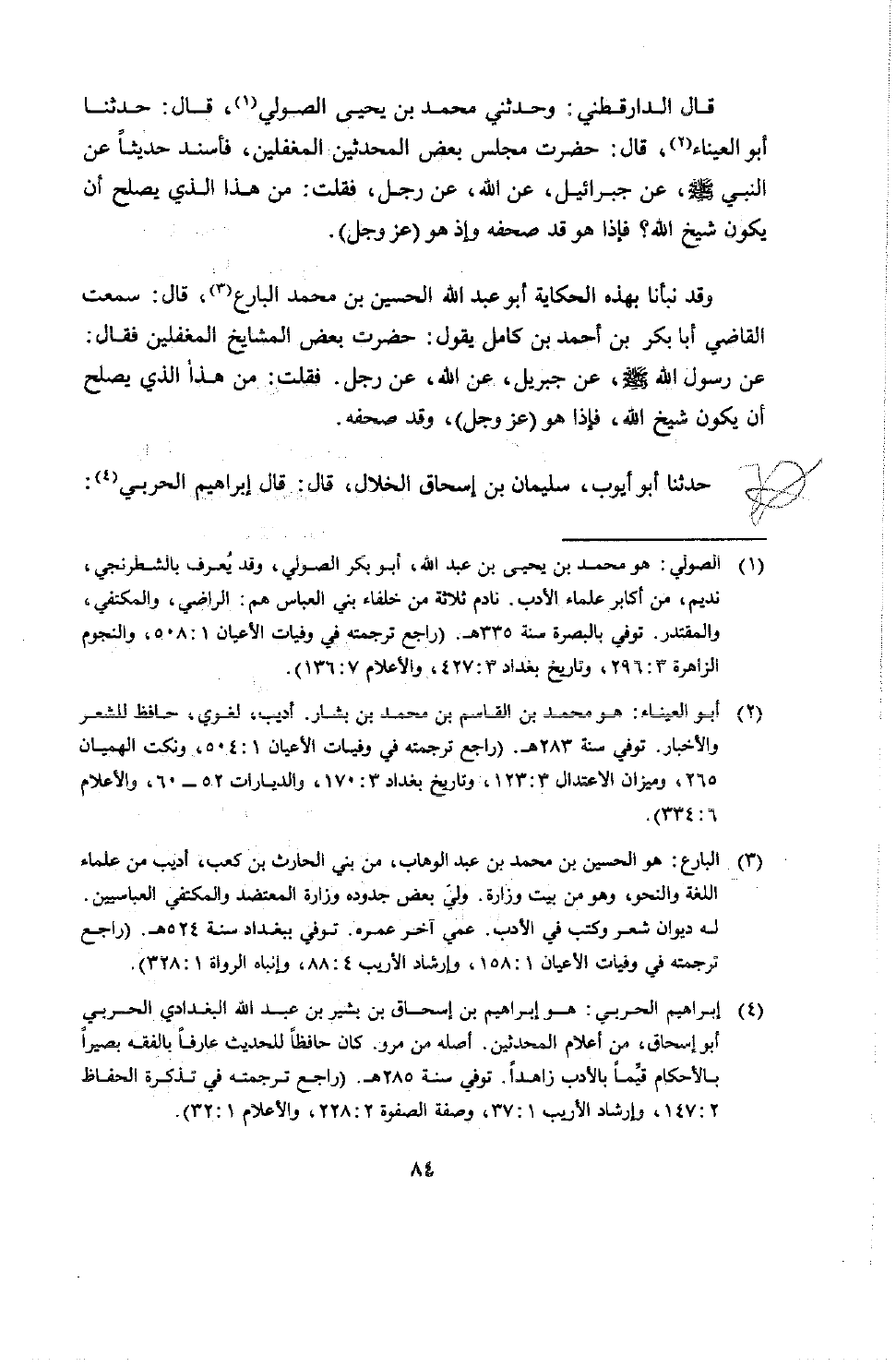 قال الدارقطني: وحدثني محمد بن يحيى الصولي قال: حدثنا أبو العيناء قال: حضرت مجلس بعض المحدثين المغفلين فأسند حديثاً عن النبي صلى الله عليه وسلم عن جبرائيل عن الله عن رجل، فقلت: من هذا الذي يصلح أن يكون شيخ الله؟ فإذا هو قد صحفه، وإذ هو عز وجل. وقد نبأنا بهذه الحكاية أبو عبد الله الحسين بن محمد البارع قال: سمعت القاضي أبا بكر بن أحمد بن كامل يقول: حضرت بعض المشايخ المغفلين فقال: عن رسول الله صلى الله عليه وسلم عن جبريل عن الله عن وجل. فقلت: من هذا الذي يصلح أن يكون شيخ الله، فإذا هو عز وجل وقد صحفه.