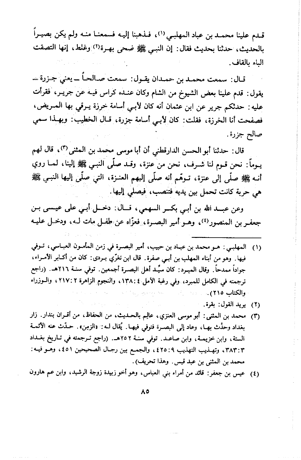 قال: حدثنا أبو الحسن الدارقطني أن أبا موسى محمد بن المثنى قال لهم يوماً: نحن قوم لنا شرف، نحن من عنزة، وقد صلى النبي صلى الله عليه وسلم إلينا، لما روي أن رسول الله صلى الله عليه وسلم صلى إلى عنزة، توهم أنه صلى إليهم وإنما العنزة التي صلى إليها النبي صلى الله عليه وسلم هي حربة كانت تحمل بين يديه فتنصب فيصلي إليها.