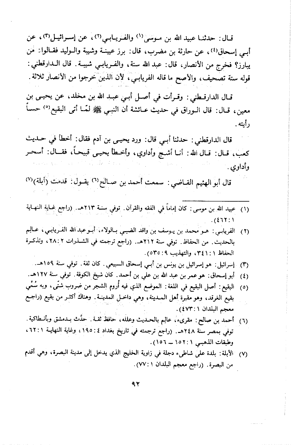 قال: حدثنا عبد الله بن موسى، والفريابي عن إسرائيل عن أبي إسحاق عن حارثة بن مضرب قال: برز عيينة وشيبة والوليد فقالوا: من يبارز؟ فخرج من الأنصار، قال عبد الله، ستة، والفريابي، شيبة، قال الدارقطني: قوله ستة تصحيف والأصح ما قاله الفريابي، لأن الذين خرجوا من الأنصار ثلاثة.