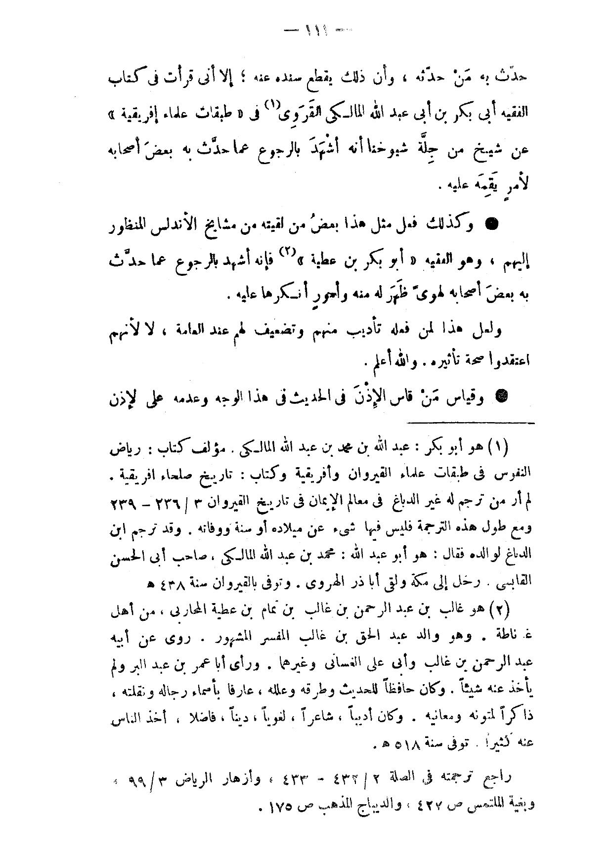 حَدَّثَ بِهِ مَنْ حَدَّثَهُ وَأَنَّ ذَلِكَ يَقْطَعُ سَنَدَهُ عَنْهُ إِلَّا أَنِّي قَرَأْتُ فِي كِتَابِ الْفَقِيهِ أَبِي بَكْرِ بْنِ أَبِي عَبْدِ اللَّهِ الْمَالِكِيِّ الْقَرَوِيِّ فِي طَبَقَاتِ عُلَمَاءِ إِفْرِيقِيةَ عَنْ شَيْخِ مِنْ جِلَّةِ شُيُوخِنَا أَنَّهُ أَشْهَدَ بِالرُّجُوعِ عَمَّا حَدَّثَ بِهِ بَعْضَ أَصْحَابِهِ لأمر يقمه عَلَيْهِ