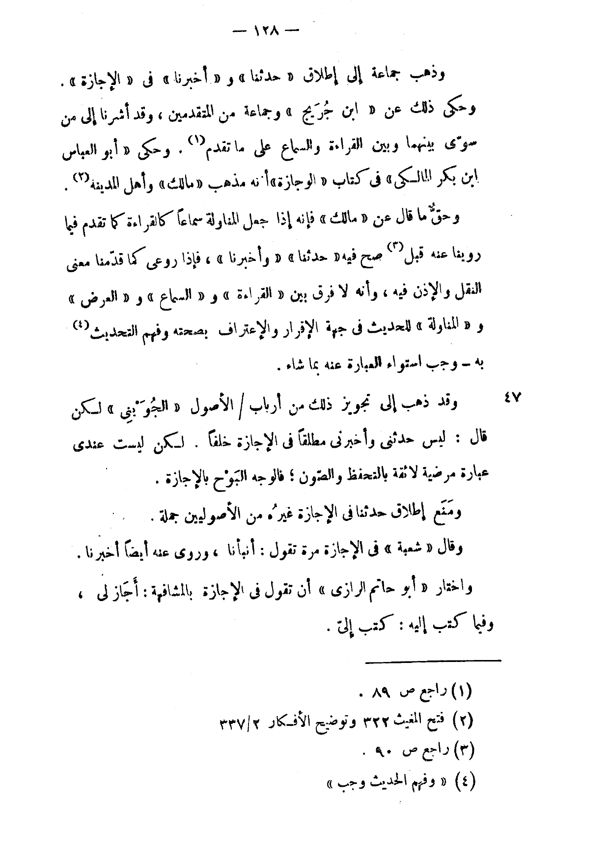 وَقَدْ ذَهَبَ إِلَى تَجْوِيزِ ذَلِكَ مِنْ أَربَابِ الْأُصُولِ الْجُوَيْنِيُّ لَكِنْ قَالَ لَيْسَ حَدَّثَنِي وَأَخْبَرَنِي مُطْلِقًا فِي الْإِجَازَةِ خَلَفًا لَكِنْ لَيْسَتْ عِنْدِي عِبَارَةٌ مُرْضِيَةٌ لَائِقَةٌ بِالتَّحَفُّظِ وَالصَّوْنِ فَالْوَجْهُ الْبَوْحُ بِالْإِجَازَةِ