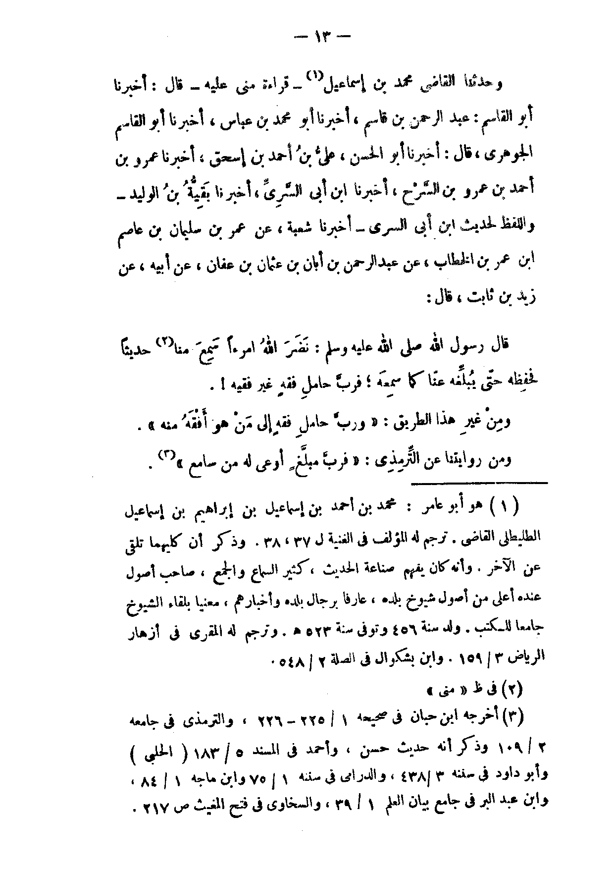 قَالَ رَسُولُ اللَّهِ صَلَّى اللَّهُ عَلَيْهِ وَسَلَّمَ نَضَّرَ اللَّهُ امْرَءًا سَمِعَ مِنَّا حَدِيثًا فَحَفِظَهُ حَتَّى يُبَلِّغَهُ عَنَّا كَمَا سَمِعَهُ فَرُبَّ حَامِلِ فِقْهٍ غَيْرِ فَقِيهٍ