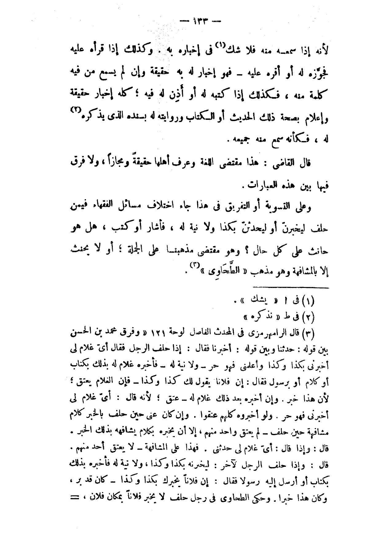 وَعَلَى التَّسْوِيَةِ أَوِ التَّفْرِيقِ فِي هَذَا جَاءَ اخْتِلَافُ مَسَائِلِ الْفُقَهَاءِ فِيمَنْ حَلَفَ لِيُخْبِرَنَّ أَوْ لِيُحَدِّثَنَّ بِكَذَا وَلَا نِيَّةَ لَهُ فَأَشَارَ أَوْ كَتَبَ هَلْ هُوَ حَانِثٌ عَلَى كُلِّ حَالٍ وَهُوَ مُقْتَضَى مَذْهَبِنَا عَلَى الْجُمْلَةِ أَوْ لَا يَحْنَثُ إِلَّا بِالْمُشَافَهَةِ وَهُوَ مَذْهَبُ الطَّحَاوِيُّ