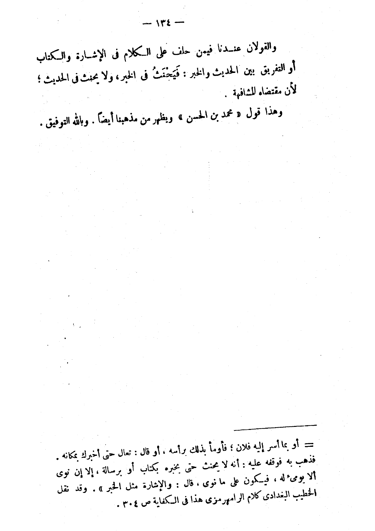 وَالْقَوْلَانِ عِنْدَنَا فِيمَنْ حَلَفَ عَلَى الْكَلَامِ فِي الْإِشَارَةِ وَالْكِتَابِ أَوِ التَّفْرِيقِ بَيْنَ الْحَدِيثِ وَالْخَبَرِ فَيَحْنَثُ فِي الْخَبَرِ وَلَا يَحْنَثُ فِي الْحَدِيثِ لِأَنَّ مُقْتَضَاهُ الْمُشَافَهَةَ