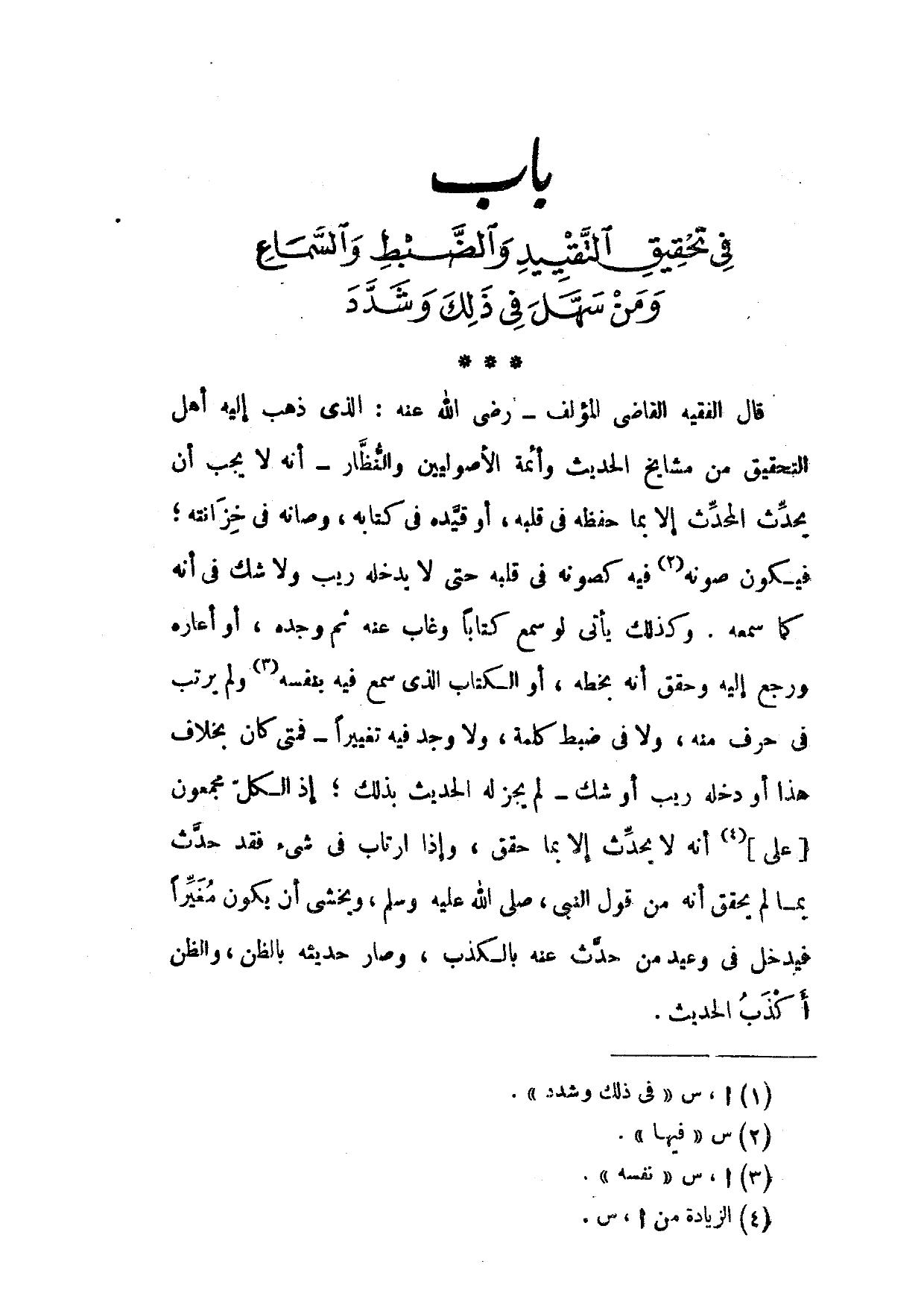 قَالَ الْفَقِيهُ الْقَاضِي الْمُؤَلِّفُ رَضِيَ اللَّهُ عَنْهُ الَّذِي ذَهَبَ إِلَيْهِ أَهْلُ التَّحْقِيقِ مِنْ مَشَايِخِ الْحَدِيثِ وَأَئِمَّةِ الْأُصُولِيِّينَ وَالنُّظَّارِ أَنَّهُ لَا يَجِبُ أَنْ يُحَدِّثَ الْمُحَدِّثُ إِلَّا مَا حَفِظَهُ فِي قَلْبِهِ أَوْ قَيَّدَهُ فِي كِتَابِهِ وَصَانَهُ فِي خِزَانَتِهِ فَيَكُونُ صَوْنُهُ فِيهِ كَصَوْنِهِ فِي قَلْبِهِ حَتَّى لَا يَدْخُلُهُ رَيْبٌ وَلَا شَكٌّ فِي أَنَّهُ كَمَا سَمِعَهُ وَكَذَلِكَ يَأْتِي لَوْ سَمِعَ كِتَابًا وَغَابَ عَنْهُ ثُمَّ وَجَدَهُ أَوْ أَعَارَهُ وَرَجَعَ إِلَيْهِ وَحَقَّقَ أَنَّهُ بِخَطِّهِ أَوِ الْكِتَابُ الَّذِي سَمِعَ فِيهِ بِنَفْسِهِ وَلَمْ يَرْتَبْ فِي حَرْفٍ مِنْهُ وَلَا فِي ضَبْطِ كَلِمَةٍ وَلَا وَجَدَ فِيهِ تَغْيِيرًا فَمَتَى كَانَ بِخِلَافِ هَذَا أَوْ دَخَلَهُ رَيْبٌ أَوْ شَكٌّ لَمْ يُجِزْ لَهُ الْحَدِيثَ بِذَلِكَ إِذِ الْكُلُّ مَجْمُعُونَ عَلَى أَنَّهُ لَا يُحَدِّثُ إِلَّا بِمَا حَقَّقَ وَإِذَا ارْتَابَ فِي شَيْءٍ فَقَدْ حَدَّثَ بِمَا لَمْ يُحَقِّقْ أَنَّهُ مِنْ قَوْلِ النَّبِيِّ صَلَّى اللَّهُ عَلَيْهِ وَسَلَّمَ ويَخْشَى أَنْ يَكُونَ مُغَيِّرًا فَيَدْخُلَ فِي وَعِيدِ مَنْ حَدَّثَ عَنْهُ بِالْكَذِبِ وَصَارَ حَدِيثُهُ بِالظَّنِ وَالظَّنُ أَكْذَبُ الْحَدِيثِ