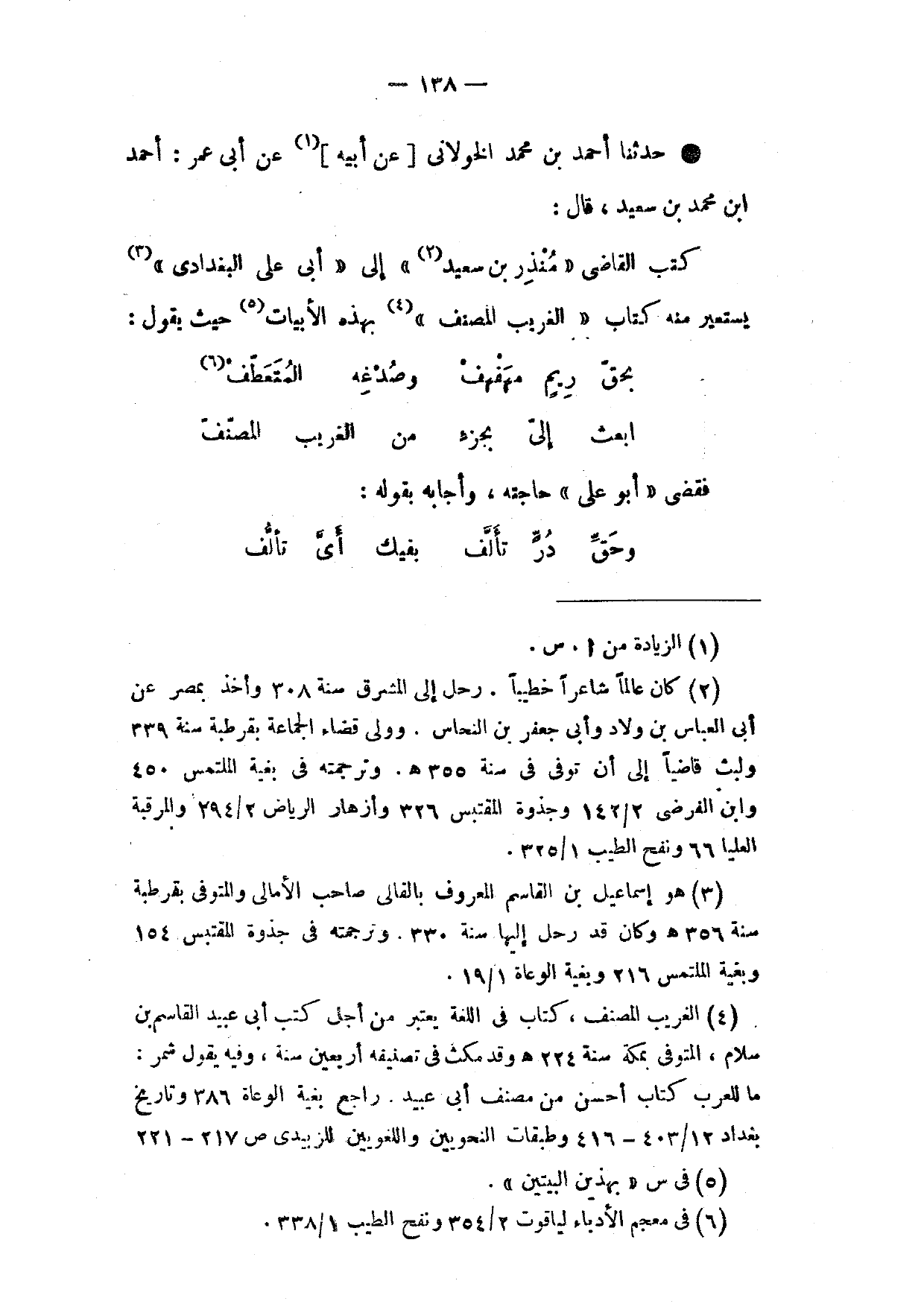 كَتَبَ الْقَاضِي مُنْذِرُ بْنُ سَعِيدٍ إِلَى أَبِي عَلِيٍّ الْبَغْدَادِيِّ يَسْتَعِيرُ مِنْهُ كِتَابَ الْغَرِيبِ الْمُصَنَّفِ بِهَذِهِ الْأَبْيَاتِ حَيْثُ يَقُولُ