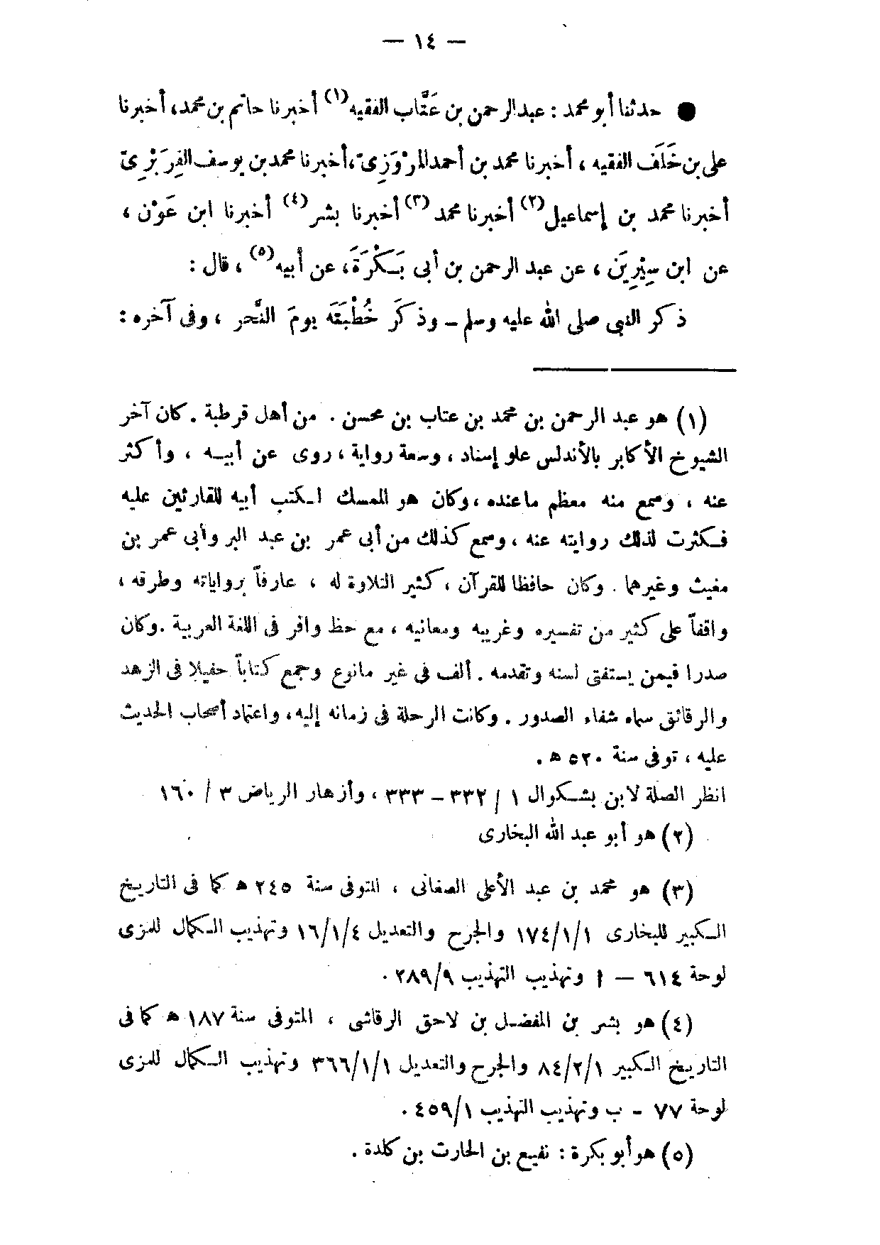 حَدَّثَنَا أَبُو مُحَمَّدٍ عَبْدُ الرَّحْمَنِ بْنُ عَتَّابٍ الْفَقِيهُ أَخْبَرَنَا حَاتِمُ بْنُ مُحَمَّدٍ أَخْبَرَنَا عَلِيُّ بْنُ خَلَفٍ الْفَقِيهُ أَخْبَرَنَا مُحَمَّدُ بْنُ أَحْمَدَ الْمَرْوَزِيُّ أَخْبَرَنَا مُحَمَّدُ بْنُ يُوسُفَ الْفَرَبْرِيُّ أَخْبَرَنَا مُحَمَّدُ بْنُ إِسْمَاعِيل أخبرنَا مُحَمَّد أَخْبَرَنَا بِشْرٌ أَخْبَرَنَا ابْنُ عَوْنٍ عَنِ ابْنِ سِيرِينَ عَنْ عَبْدِ الرَّحْمَنِ بْنِ أَبِي بَكْرَةَ عَنْ أَبِيهِ قَالَ