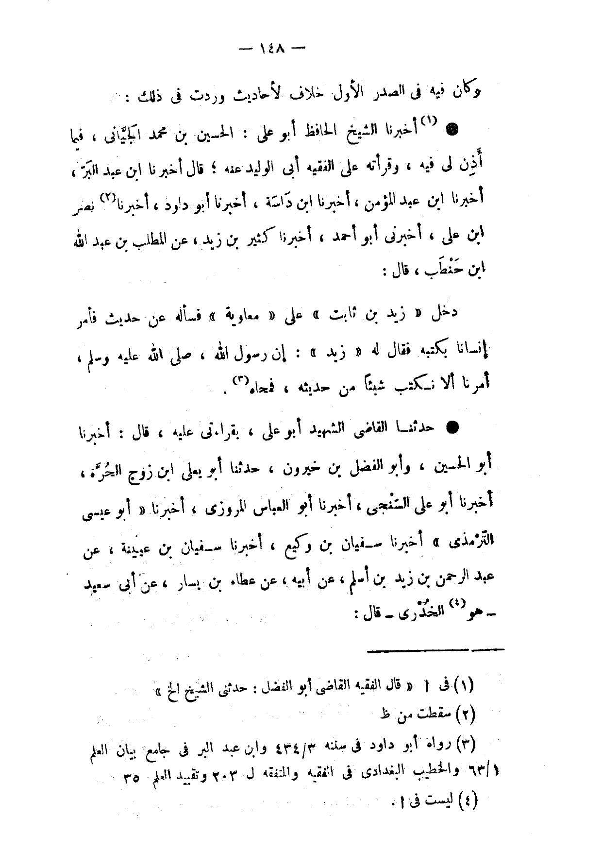 أَخْبَرَنَا الشَّيْخُ الْحَافِظُ أَبُو عَلِيٍّ الْحُسَيْنُ بْنُ مُحَمَّدٍ الْجَيَّانِيُّ فِيمَا أَذِنَ لِي فِيهِ وَقَرَأْتُهُ عَلَى الْفَقِيهِ أَبِي الْوَلِيدِ عَنْهُ قَالَ أَخْبَرَنَا ابْنُ عَبْدِ الْبَرِّ أَخْبَرَنَا ابْنُ عَبْدِ الْمُؤْمِنِ أَخْبَرَنَا ابْنُ دَاسَةَ أَخْبَرَنَا أَبُو دَاوُدَ أَخْبَرَنَا نصر ابْن عَلِيٍّ أَخْبَرَنِي أَبُو أَحْمَدَ أَخْبَرَنَا كَثِيرُ بْنُ زَيْدٍ عَنِ الْمُطَّلِبِ بن عبد الله ابْن حَنْطَبٍ قَالَ