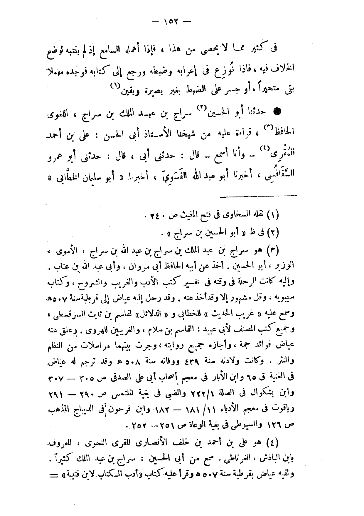 حَدَّثَنَا أَبُو الْحُسَيْنِ سِرَاجُ بْنُ عَبْدِ الْمَلِكِ بْنِ سِرَاجٍ اللُّغَوِيُّ الْحَافِظُ قِرَاءَةً عَلَيْهِ مِنْ شَيْخِنَا الْأُسْتَاذِ أَبِي الْحَسَنِ عَلِيِّ بْنِ أَحْمَدَ الْمُقْرِيِّ وَأَنَا أَسْمَعُ قَالَ حَدَّثَنِي أَبِي قَالَ حَدَّثَنِي أَبُو عَمْرٍو السَّفَاقُسِيُّ أَخْبَرَنَا أَبُو عَبْدِ اللَّهِ الْفَسَوِيُّ أَخْبَرَنَا أَبُو سُلَيْمَانَ الْخَطَّابِيُّ