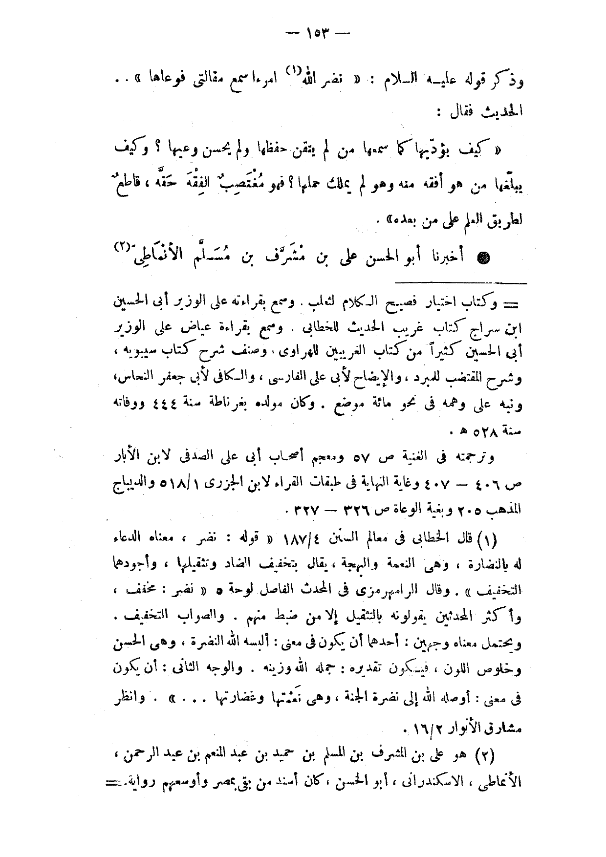 وَذَكَرَ قَوْلَهُ عَلَيْهِ السَّلَامُ نَضَّرَ الله امرء اسْمَع مَقَالَتِي فَوَعَاهَا الْحَديِثَ فَقَالَ