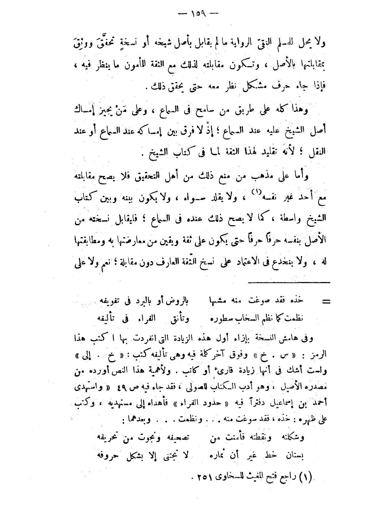 وَلَا يَحِلُّ لِلْمُسْلِمِ التَّقِيِّ الرِّوَايَةُ مَا لَمْ يُقَابِلْ بِأَصْلِ شَيْخِهِ أَوْ نُسْخَةٍ تُحَقَّقُ وَوَثِقَ بِمُقَابَلَتِهَا بِالْأَصْلِ وَتَكُونُ مُقَابَلَتُهُ لِذَلِكَ مَعَ الثِّقَةِ الْمَأْمُونِ مَا يَنْظُرُ فِيهِ فَإِذَا جَاءَ حَرْفٌ مُشْكَلٌ نَظَرَ مَعَهُ حَتَّى يُحَقِّقُ ذَلِكَ