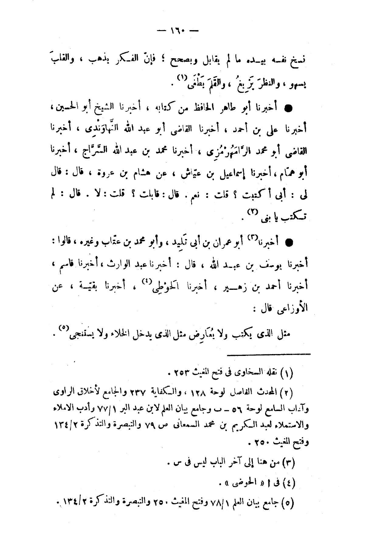 أَخْبَرَنَا أَبُو طَاهِرٍ الْحَافِظُ مِنْ كِتَابِهِ أَخْبَرَنَا الشَّيْخُ أَبُو الْحُسَيْنِ أَخْبَرَنَا عَلِيُّ بْنُ أَحْمَدَ أَخْبَرَنَا الْقَاضِي أَبُو عَبْدِ اللَّهِ النَّهَاوَنْدِيُّ أَخْبَرَنَا الْقَاضِي أَبُو مُحَمَّدٍ الرَّامَهُرْمُزِيُّ أَخْبَرَنَا مُحَمَّدُ بْنُ عَبْدِ اللَّهِ السَّرَّاجُ أَخْبَرَنَا أَبُو هَمَّامٍ أَخْبَرَنَا إِسْمَاعِيلُ بْنُ عَيَّاشٍ عَنْ هِشَامِ بْنِ عُرْوَةَ قَالَ قَالَ لِي أَبِي أَكَتَبْتَ قُلْتُ نَعَمْ قَالَ قَابَلْتَ قُلْتُ لَا قَالَ لَمْ تَكْتُبْ يَا بُنَيَّ
