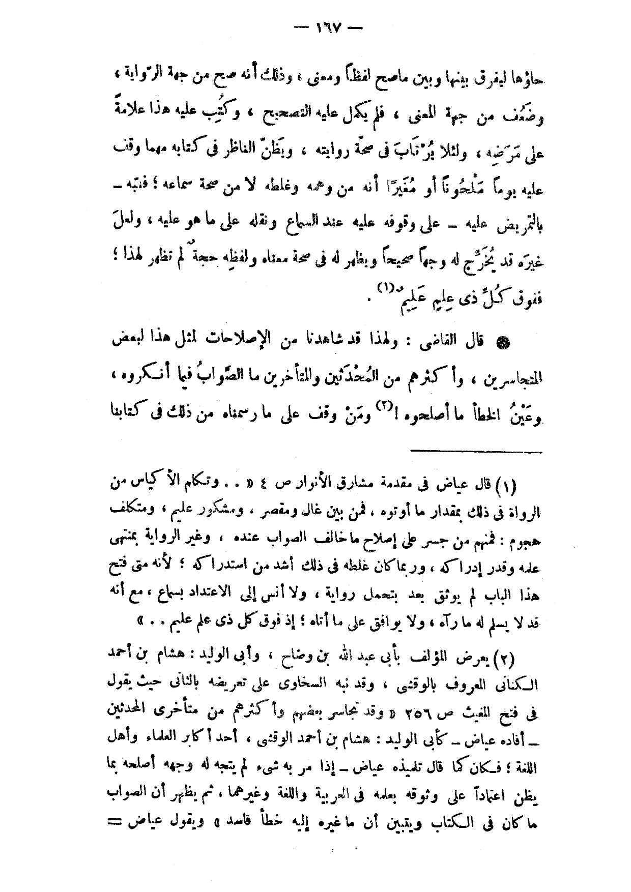 قَالَ الْقَاضِي وَلِهَذَا قَدْ شَاهَدْنَا مِنَ الْإِصْلَاحَاتِ لِمِثْلِ هَذَا لِبَعْضِ الْمُتَجَاسِرِينَ وَأَكْثَرُهُمْ مِنَ الْمُحْدَثِينَ وَالْمُتَأَخِّرِينَ مَا الصَّوَابُ فِيمَا أَنْكَرُوهُ وَعَيْنُ الْخَطَأِ مَا أَصْلَحُوهُ وَمَنْ وَقَفَ عَلَى مَا رَسَمْنَاهُ مِنْ ذَلِكَ فِي كِتَابِنَا