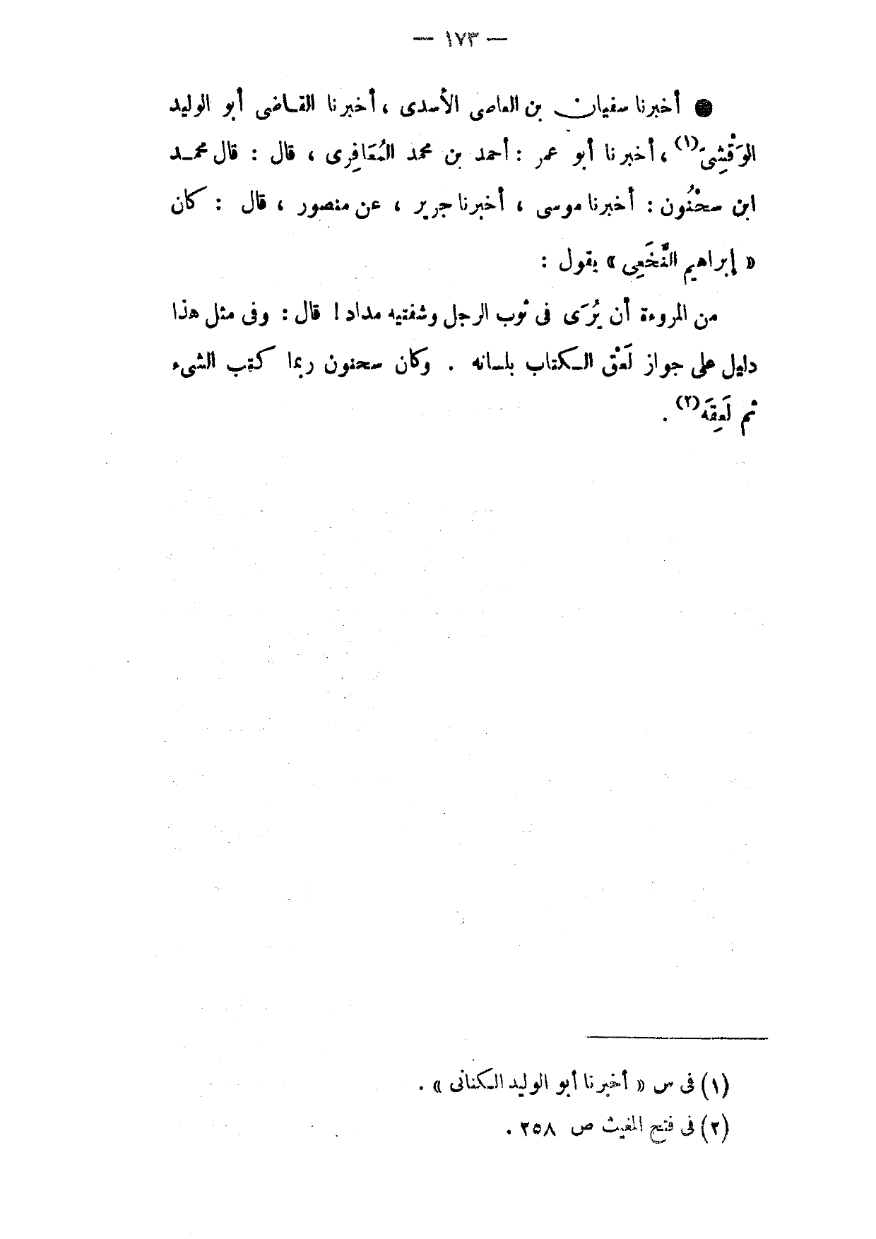 أَخْبَرَنَا سُفْيَانُ بْنُ الْعَاصِي الْأَسَدِيُّ أَخْبَرَنَا الْقَاضِي أَبُو الْوَلِيدِ الْوَقْشِيُّ أَخْبَرَنَا أَبُو عُمَرَ أَحْمَدُ بْنُ مُحَمَّدٍ الْمَعَافِرِيُّ قَالَ قَالَ مُحَمَّدُ ابْن سَحْنُونٍ أَخْبَرَنَا مُوسَى أَخْبَرَنَا جُرَيْرٌ عَنْ مَنْصُورٍ قَالَ كَانَ إِبْرَاهِيمُ النَّخَعِيُّ يَقُولُ