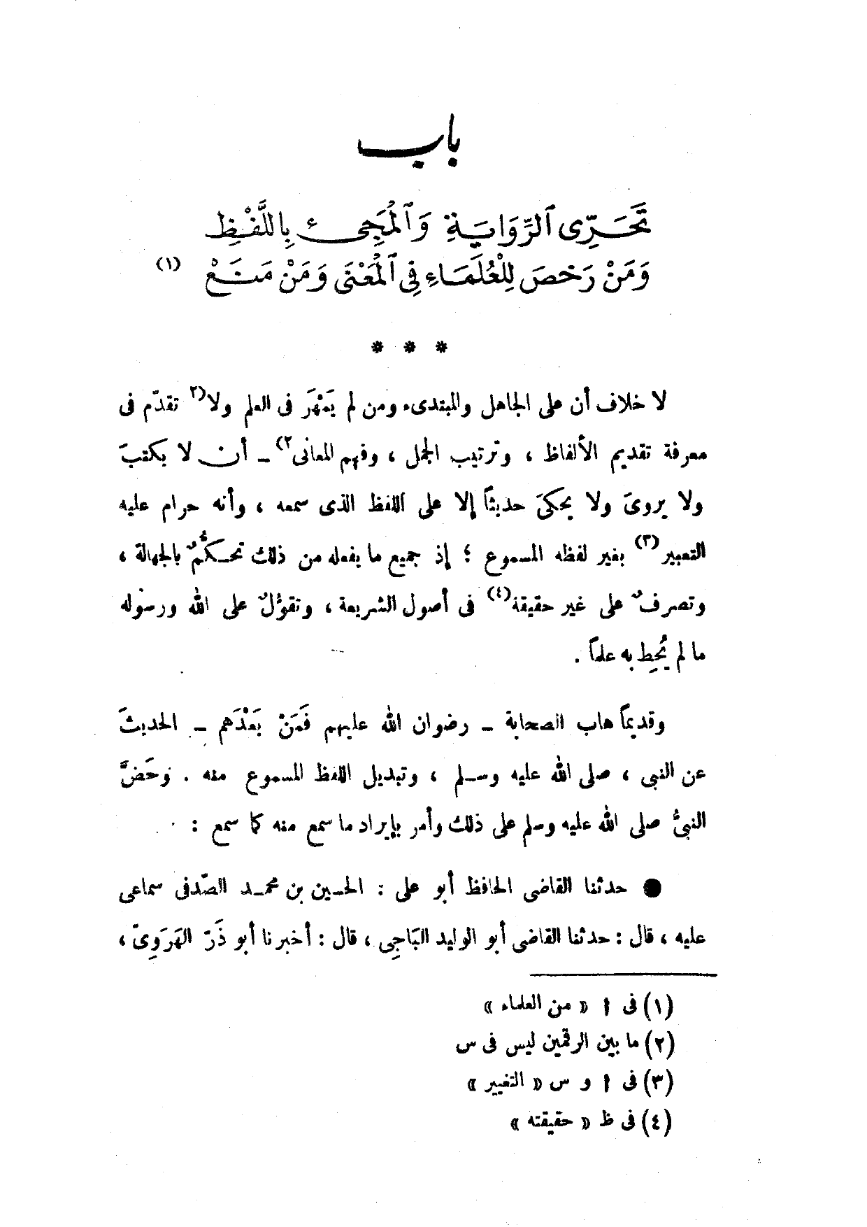 وَقَدِيمًا هَابَ الصَّحَابَةُ رِضْوَانُ اللَّهِ عَلَيْهِمْ فَمن بعدهمْ الحَدِيث عَنِ النَّبِيِّ صَلَّى اللَّهُ عَلَيْهِ وَسَلَّمَ وَتَبْدِيلَ اللَّفْظِ الْمَسْمُوعِ مِنْهُ وَحَضَّ النَّبِيُّ صَلَّى اللَّهُ عَلَيْهِ وَسَلَّمَ عَلَى ذَلِكَ وَأَمَرَ بِإِيرَادِ مَا سُمِعَ مِنْهُ كَمَا سَمِعَ