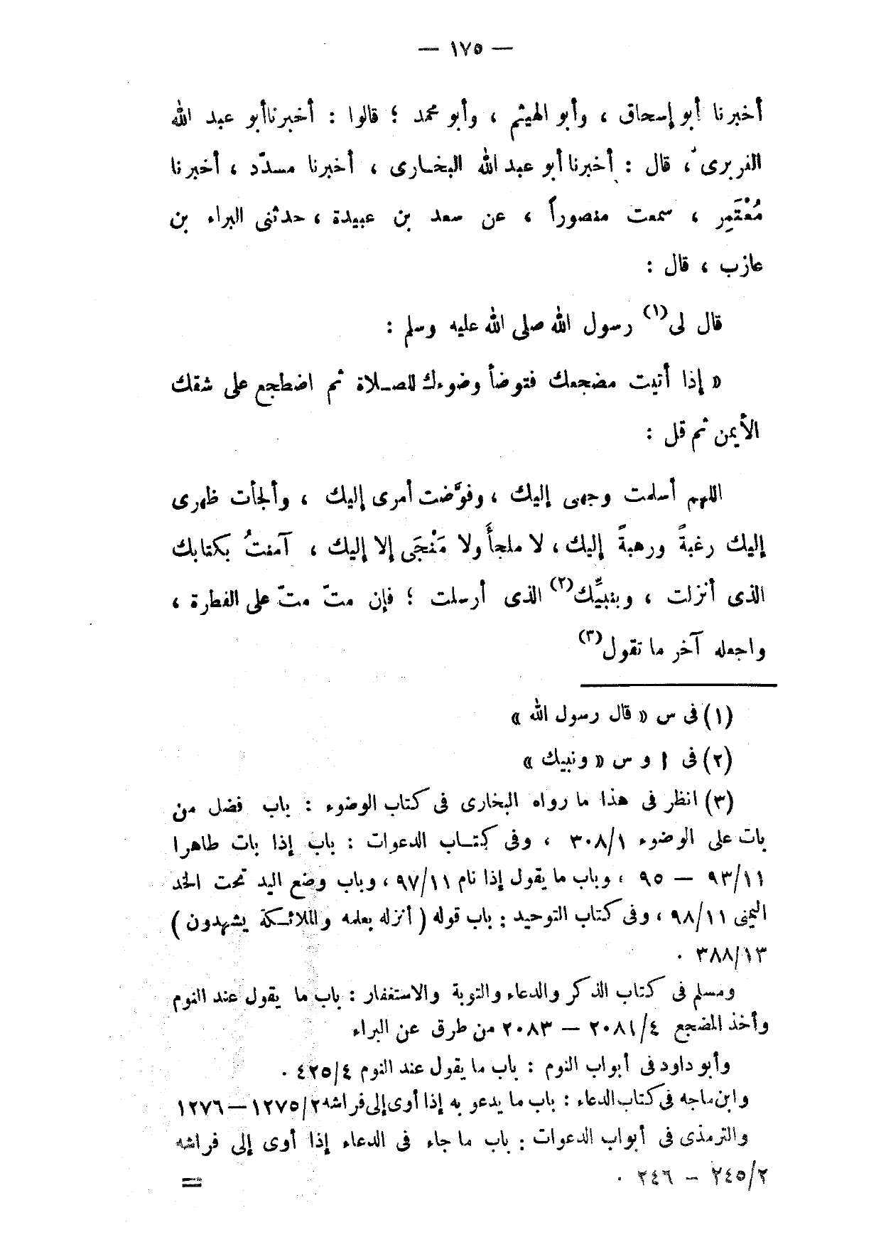 اللَّهُمَّ أَسْلَمْتُ وَجْهِي إِلَيْكَ وَفَوَّضْتُ أَمْرِي إِلَيْكَ وَأَلْجَأْتُ ظَهْرِي إِلَيْكَ رَغْبَةً وَرَهْبَةً إِلَيْكَ لَا مَلْجَأَ وَلَا مَنْجَى إِلَّا إِلَيْكَ آمَنْتُ بِكِتَابِكَ الَّذِي أَنْزَلْتَ وَبِنَبِيِّكَ الَّذِي أَرْسَلْتَ فَإِنْ مِتَّ مِتَّ عَلَى الْفِطْرَةِ وَاجْعَلْهُ آخِرَ مَا تَقُولُ