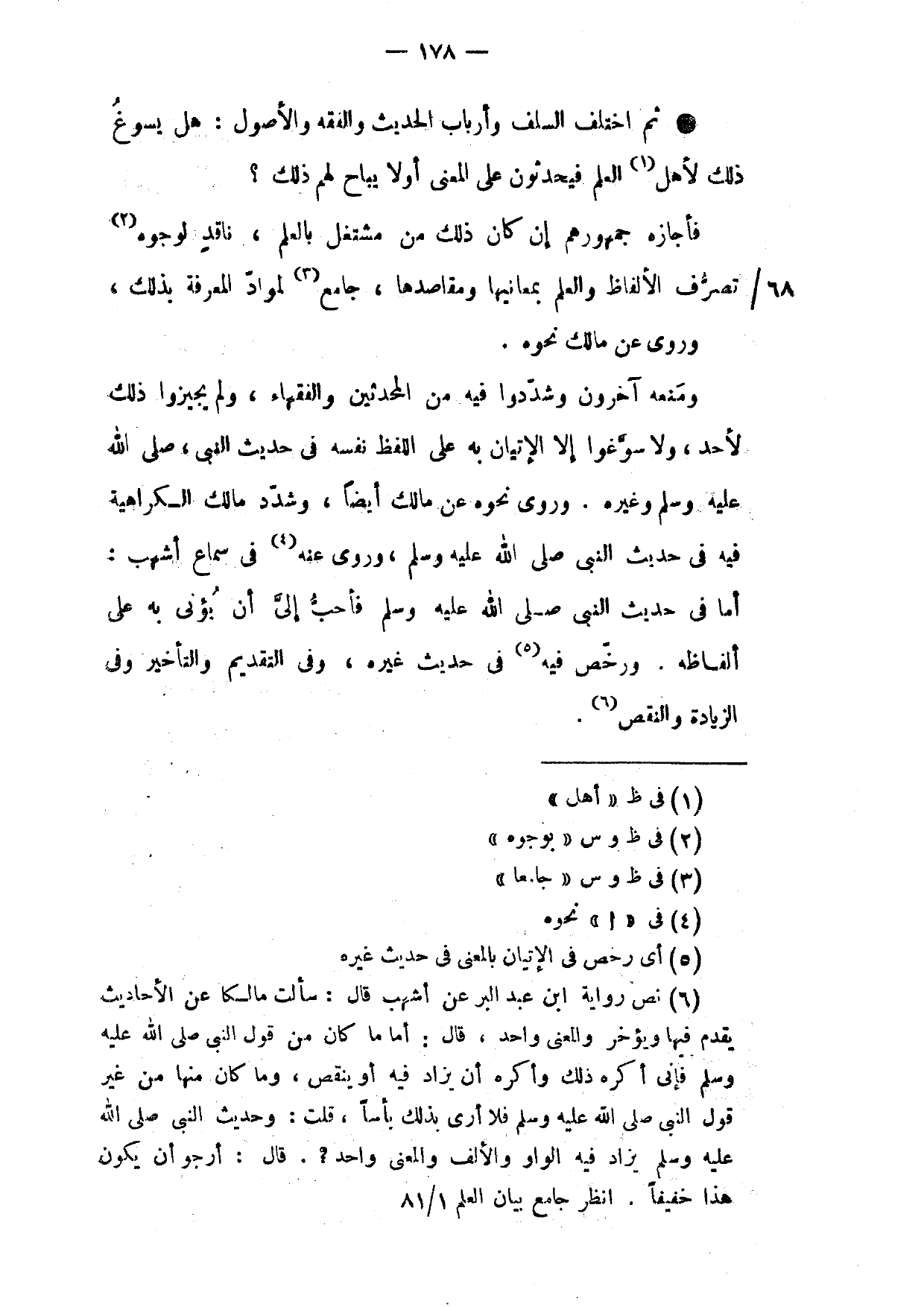 ثُمَّ اخْتَلَفَ السَّلَفُ وَأَرْبَابُ الْحَدِيثِ وَالْفِقْهِ وَالْأُصُولِ هَلْ يَسُوغُ ذَلِكَ لِأَهْلِ الْعِلْمِ فَيُحَدِّثُونَ عَلَى الْمَعْنَى أَولا يُبَاحُ لَهُمْ ذَلِكَ