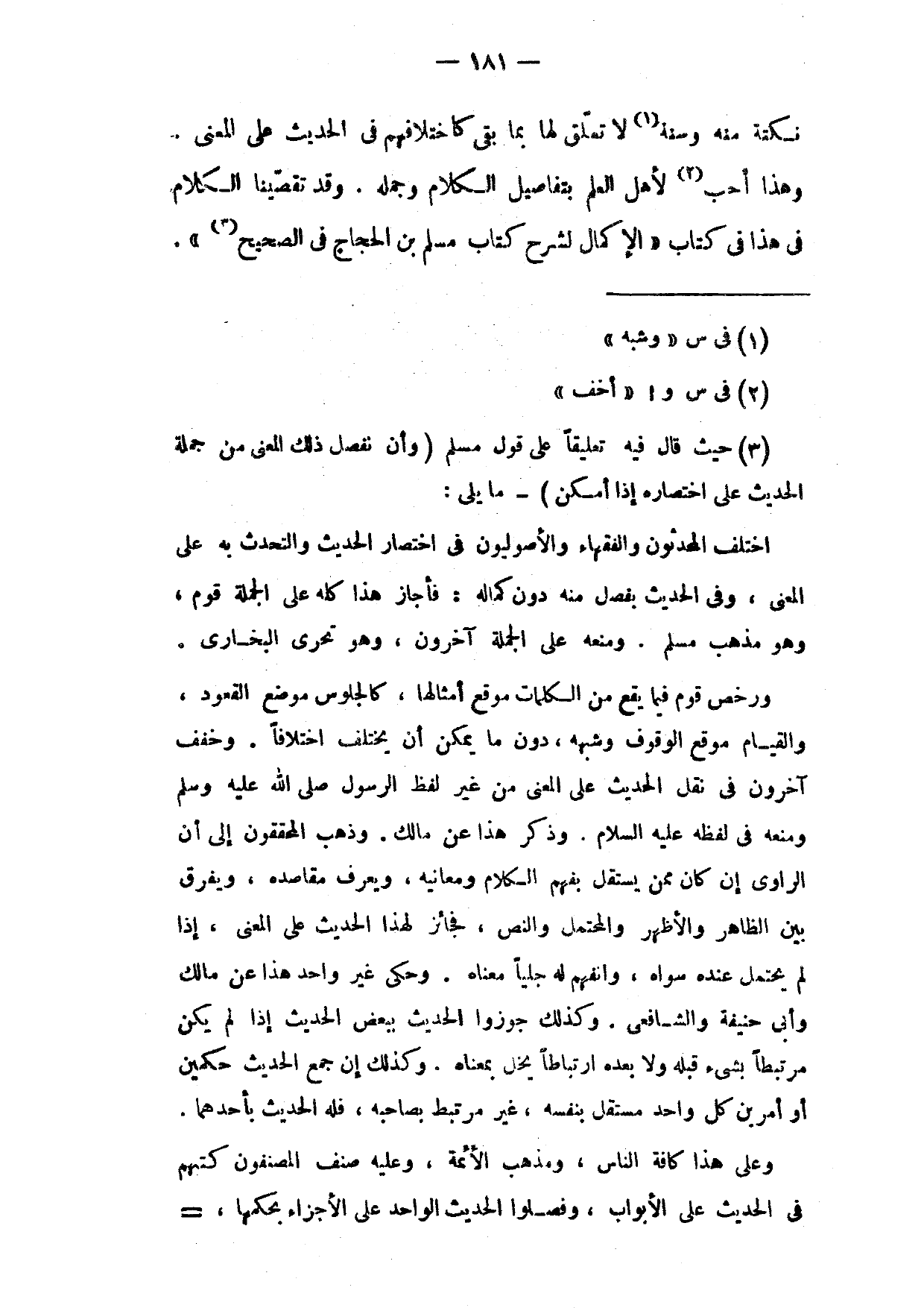نُكْتَةٍ مِنْهُ وَسُنَّةٍ لَا تَعَلُّقَ لَهَا بِمَا بَقِيَ كَاخْتِلَافِهِمْ فِي الْحَدِيثِ عَلَى الْمَعْنَى وَهَذَا أَحَبُّ لِأَهْلِ الْعِلْمِ بِتَفَاصِيلِ الْكَلَامِ وَجُمَلِهِ وَقَدْ تَقَصَّيْنَا الْكَلَامَ فِي هَذَا فِي كِتَابِ الْإِكْمَالِ لُشَرْحِ كِتَابِ مُسْلِمِ بْنِ الْحَجَّاجِ فِي الصَّحِيحِ