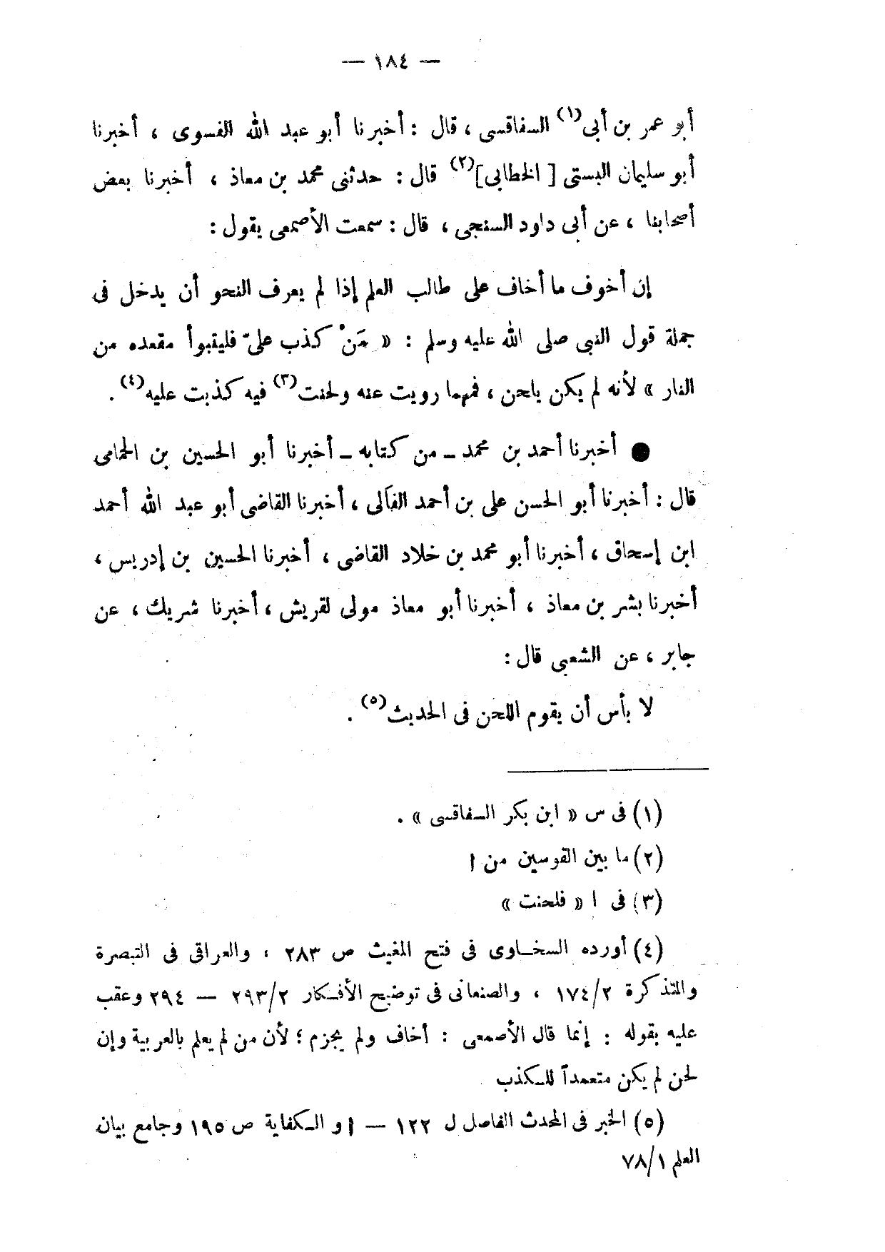 أَبُو عُمَرَ بْنُ أَبِي السَّفَاقُسِيِّ قَالَ أَخْبَرَنَا أَبُو عَبْدِ اللَّهِ الْفَسَوِيُّ أَخْبَرَنَا أَبُو سُلَيْمَانَ الْبُسْتِيُّ الْخَطَّابِيُّ قَالَ حَدَّثَنِي مُحَمَّدُ بْنُ مُعَاذٍ أَخْبَرَنَا بَعْضُ أَصْحَابِنَا عَنْ أَبِي دَاوُدَ السِّنْجِيِّ قَالَ سَمِعْتُ الْأَصْمَعِيَّ يَقُولُ