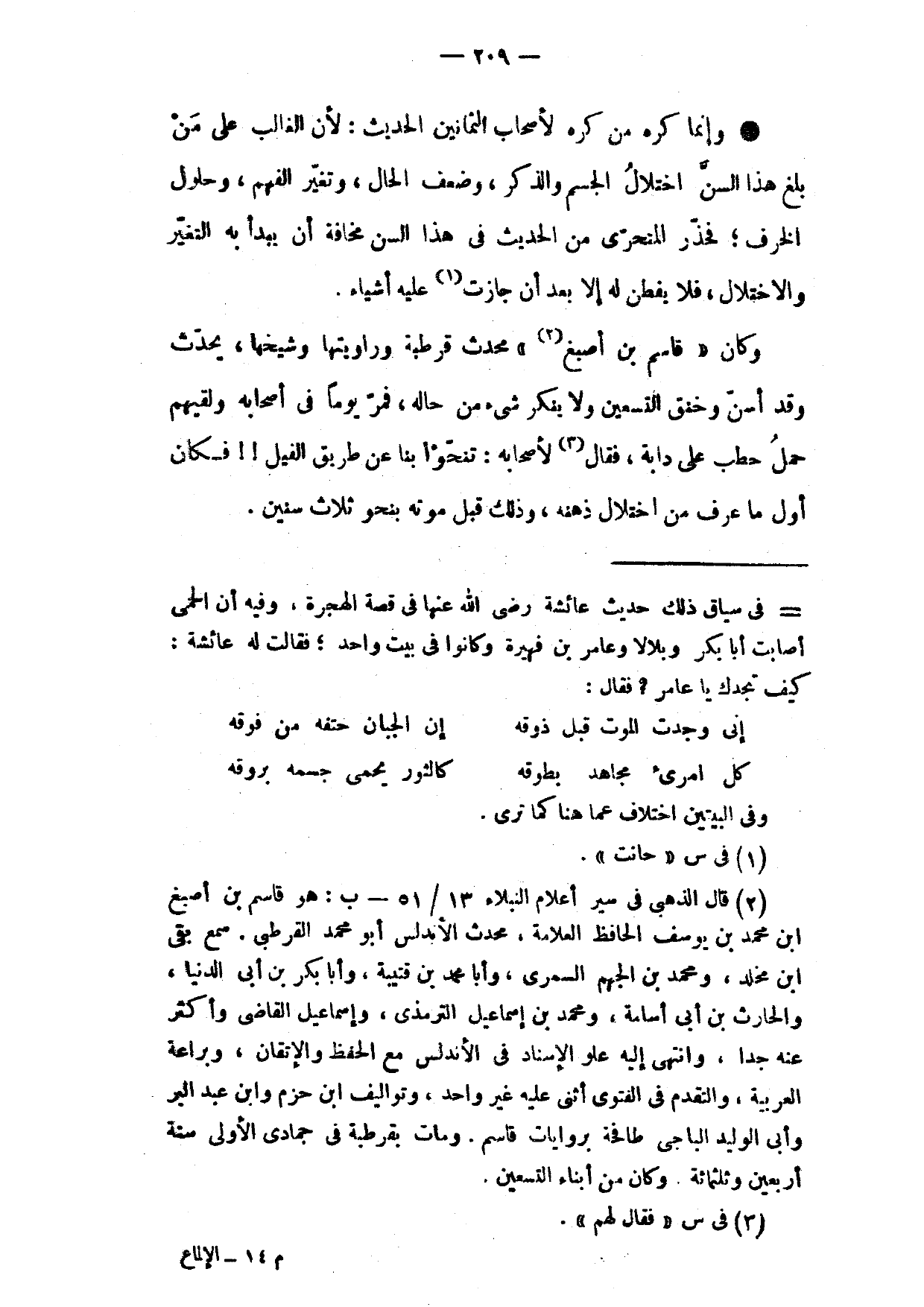 وَكَانَ قَاسِمُ بْنُ أَصْبَغَ مُحَدِّثُ قُرْطُبَةَ وَرَاوِيَتُهَا وَشَيْخُهَا يُحَدِّثُ وَقَدْ أَسَنَّ وَخَنَقَ التِّسْعِينَ وَلَا يُنْكَرُ شَيْءٌ مِنْ حَالِهِ فَمَرَّ يَوْمًا فِي أَصْحَابِهِ وَلَقِيَهُمْ حِمْلُ حَطَبٍ عَلَى دَابَةٍ فَقَالَ لِأَصْحَابِهِ تَنَحَوْا بِنَا عَنْ طَرِيقِ الْفِيلِ فَكَانَ أَوَّلُ مَا عُرِفَ مِنَ اخْتِلَالِ ذِهْنِهِ وَذَلِكَ قَبْلَ مَوْتِهِ بِنَحْوِ ثَلَاثِ سِنِينَ