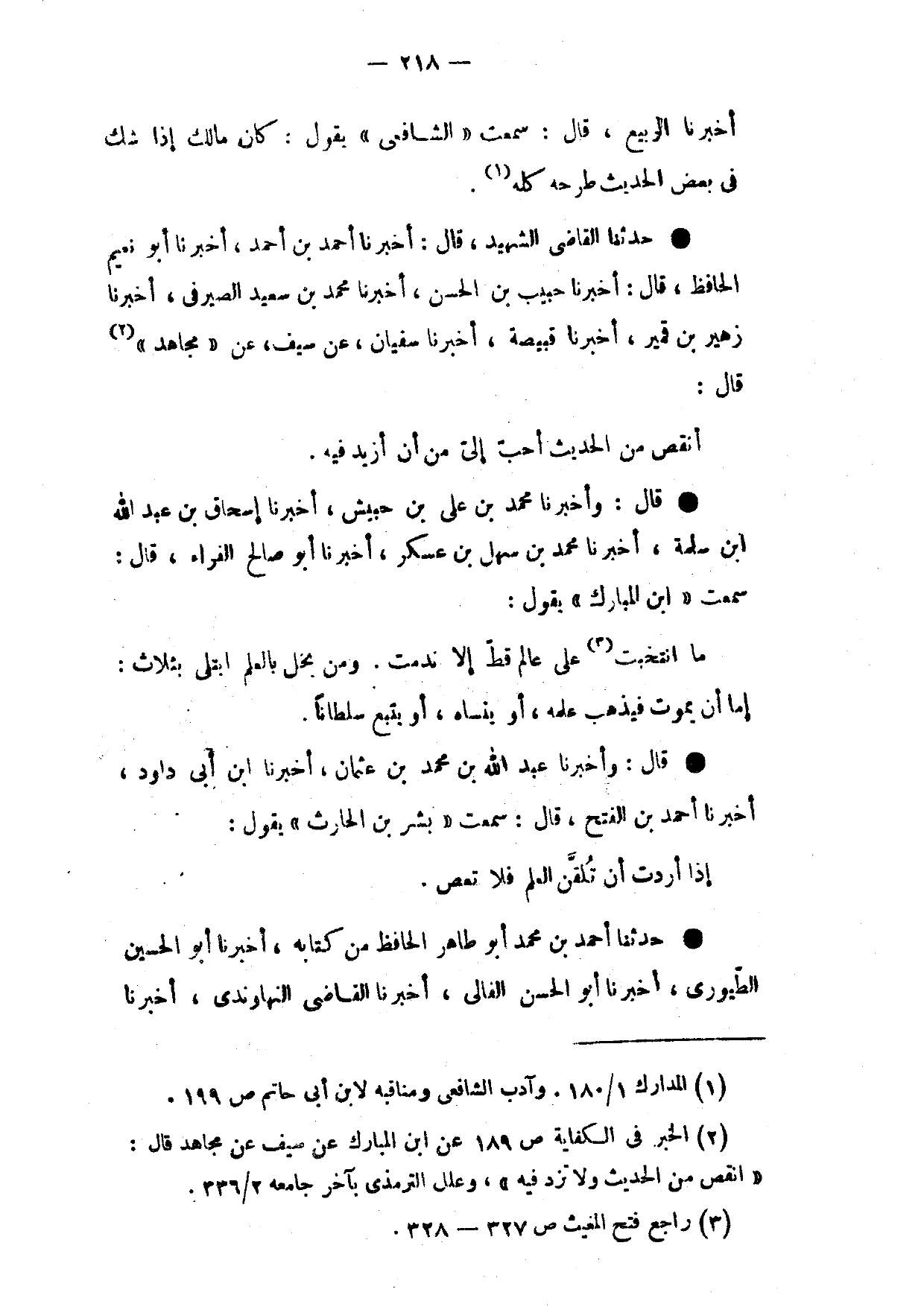 حَدَّثَنَا الْقَاضِي الشَّهِيدُ قَالَ أَخْبَرَنَا أَحْمَدُ بْنُ أَحْمَدَ أَخْبَرَنَا أَبُو نُعَيْمٍ الْحَافِظُ قَالَ أَخْبَرَنَا حَبِيبُ بْنُ الْحَسَنِ أَخْبَرَنَا مُحَمَّدُ بْنُ سَعِيدٍ الصَّيْرَفِيُّ أَخْبَرَنَا زُهَيْرُ بْنُ قُمَيْرٍ أَخْبَرَنَا قَبِيصَةُ أَخْبَرَنَا سُفْيَانُ عَنْ سَيْفٍ عَنْ مُجَاهِدٍ قَالَ