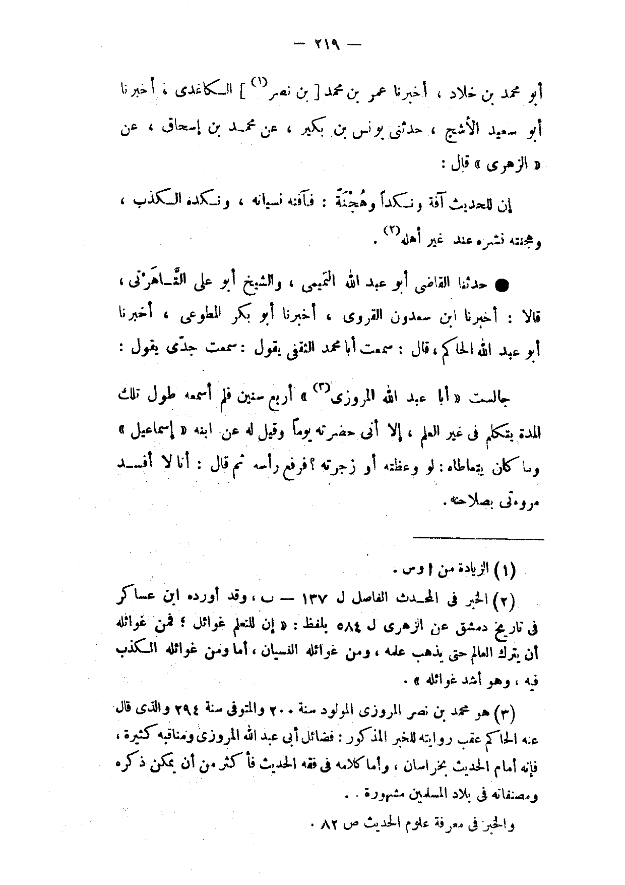 إِنَّ لِلْحَدِيثِ آفَةً وَنَكَدًا وهجنة فآفنه نِسْيَانُهُ وَنَكَدُهُ الْكَذِبُ وَهُجْنَتُهُ نَشْرُهُ عِنْدَ غَيْرِ أَهْلِهِ