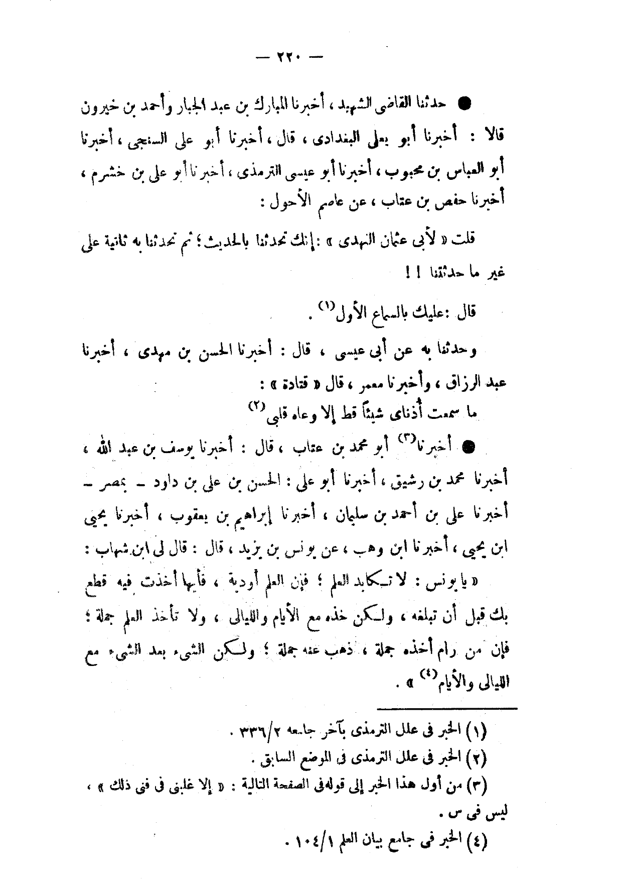حَدَّثَنَا الْقَاضِي الشَّهِيدُ أَخْبَرَنَا الْمُبَارَكُ بن عبد الجبار وَأَحْمَدُ بْنُ خَيْرُونَ قَالَا أَخْبَرَنَا أَبُو يَعْلَى الْبَغْدَادِيُّ قَالَ أَخْبَرَنَا أَبُو عَلِيٍّ السِّنْجِيُّ أَخْبَرَنَا أَبُو الْعَبَّاسِ بْنُ مَحْبُوبٍ أَخْبَرَنَا أَبُو عِيسَى التِّرْمِذِيُّ أَخْبَرَنَا أَبُو عَلِيِّ بْنُ خَشْرَمٍ أَخْبَرَنَا حَفْصُ بْنُ عَتَّابٍ عَنْ عَاصِمٍ الْأَحْوَلِ