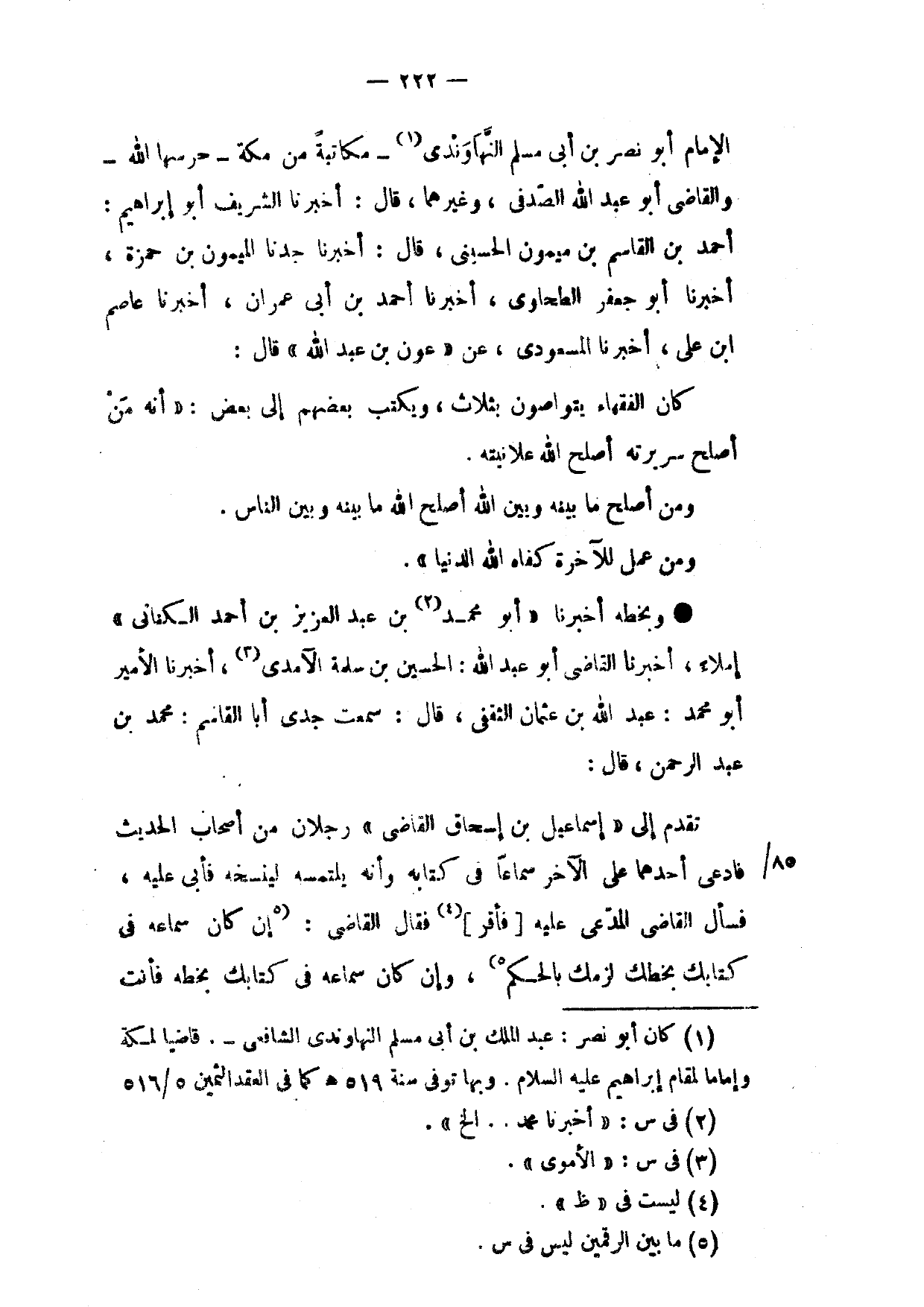 الْإِمَامُ أَبُو نَصْرِ بْنِ أَبِي مُسْلِمٍ النَّهَاوَنْدَيُّ مُكَاتَبَةً مِنْ مَكَّةَ حَرَسَهَا اللَّهُ وَالْقَاضِي أَبُو عَبْدِ الله الصدقى وَغَيْرُهُمَا قَالَ أَخْبَرَنَا الشَّرِيفُ أَبُو إِبْرَاهِيمَ أَحْمَدُ بْنُ الْقَاسِمِ بْنِ مَيْمُونٍ الْحُسَيْنِيُّ قَالَ أَخْبَرَنَا جَدُّنَا الْمَيْمُونُ بْنُ حَمْزَةَ أَخْبَرَنَا أَبُو جَعْفَرٍ الطَّحَاوِيُّ أَخْبَرَنَا أَحْمَدُ بْنُ أَبى عمرَان أخبرنَا عَاصِم ابْن عَلِيٍّ أَخْبَرَنَا الْمَسْعُودِيُّ عَنْ عَوْنِ بْنِ عَبْدِ اللَّهِ قَالَ