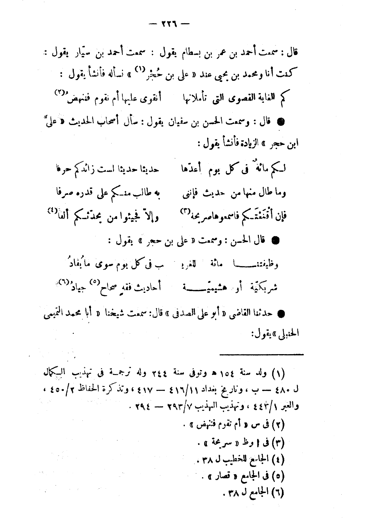 قَالَ سَمِعْتُ أَحْمَدَ بْنَ عُمَرَ بْنِ بِسْطَامٍ يَقُولُ سَمِعْتُ أَحْمَدَ بْنَ سَيَّارٍ يَقُولُ كُنْتُ أَنَا وَمُحَمَّدُ بْنُ يَحْيَى عِنْدَ عَلِيِّ بْنِ حَجَرٍ نَسْأَلُهُ فَأَنْشَأَ يَقُولُ