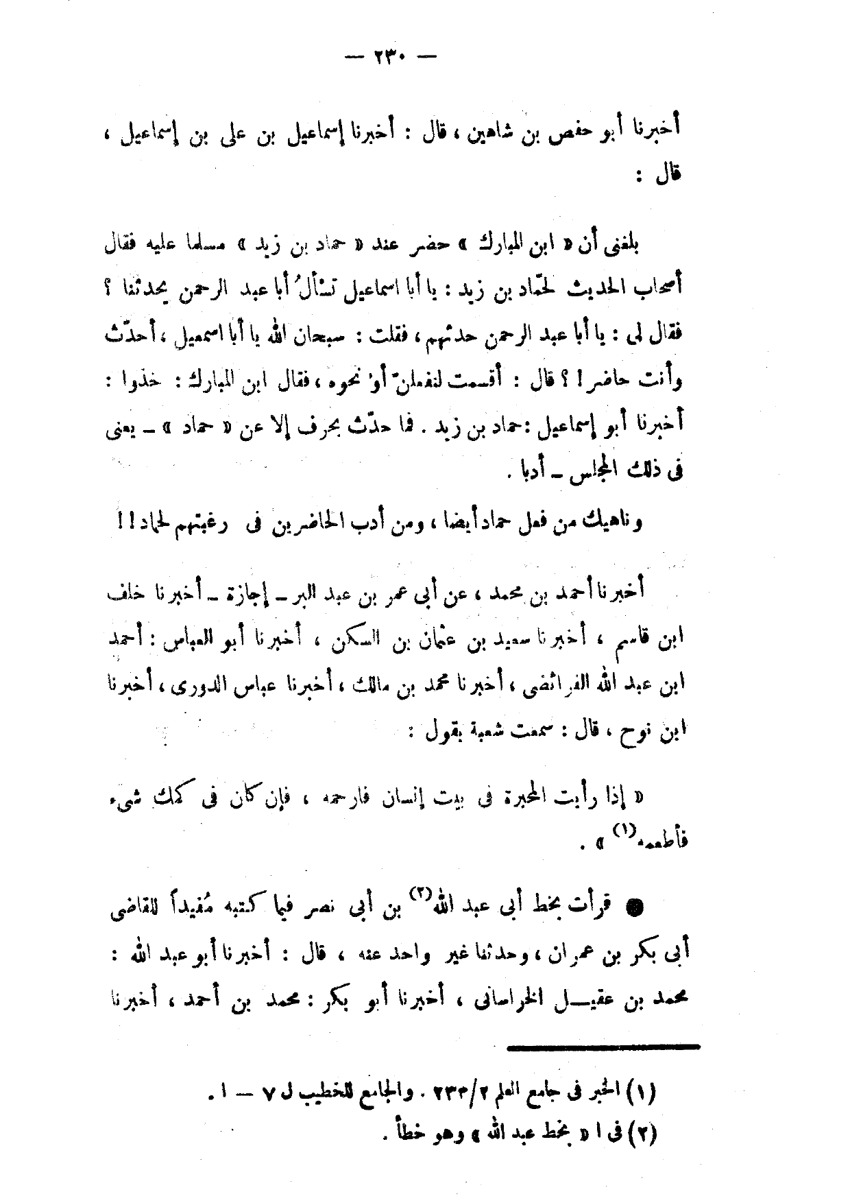 بَلَغَنِي أَنَّ ابْنَ الْمُبَارَكِ حَضَرَ عِنْدَ حَمَّادِ بْنِ زَيْدٍ مُسَلِّمًا عَلَيْهِ فَقَالَ أَصْحَابُ الْحَدِيثِ لِحَمَّادِ بْنِ زَيْدٍ يَا أَبَا إِسْمَاعِيلَ تَسْأَلُ أَبَا عَبْدِ الرَّحْمَنِ يُحَدِّثُنَا فَقَالَ لِي يَا أَبَا عَبْدِ الرَّحْمَنِ حَدِّثْهُمْ فَقُلْتُ سُبْحَانَ اللَّهِ يَا أَبَا إِسْمَاعِيلَ أُحَدِّثُ وَأَنْتَ حَاضِرٌ قَالَ أَقْسَمْتُ لَنَفْعَلَنَّ أَوْ نَحْوُهُ فَقَالَ ابْنُ الْمُبَارَكِ خُذُوا أَخْبَرَنَا أَبُو إِسْمَاعِيلَ حَمَّادُ بْنُ زَيْدٍ فَمَا حَدَّثَ بِحَرْفٍ إِلَّا عَنْ حَمَّادٍ يَعْنِي فِي ذَلِكَ الْمَجْلِسِ أَدَبًا