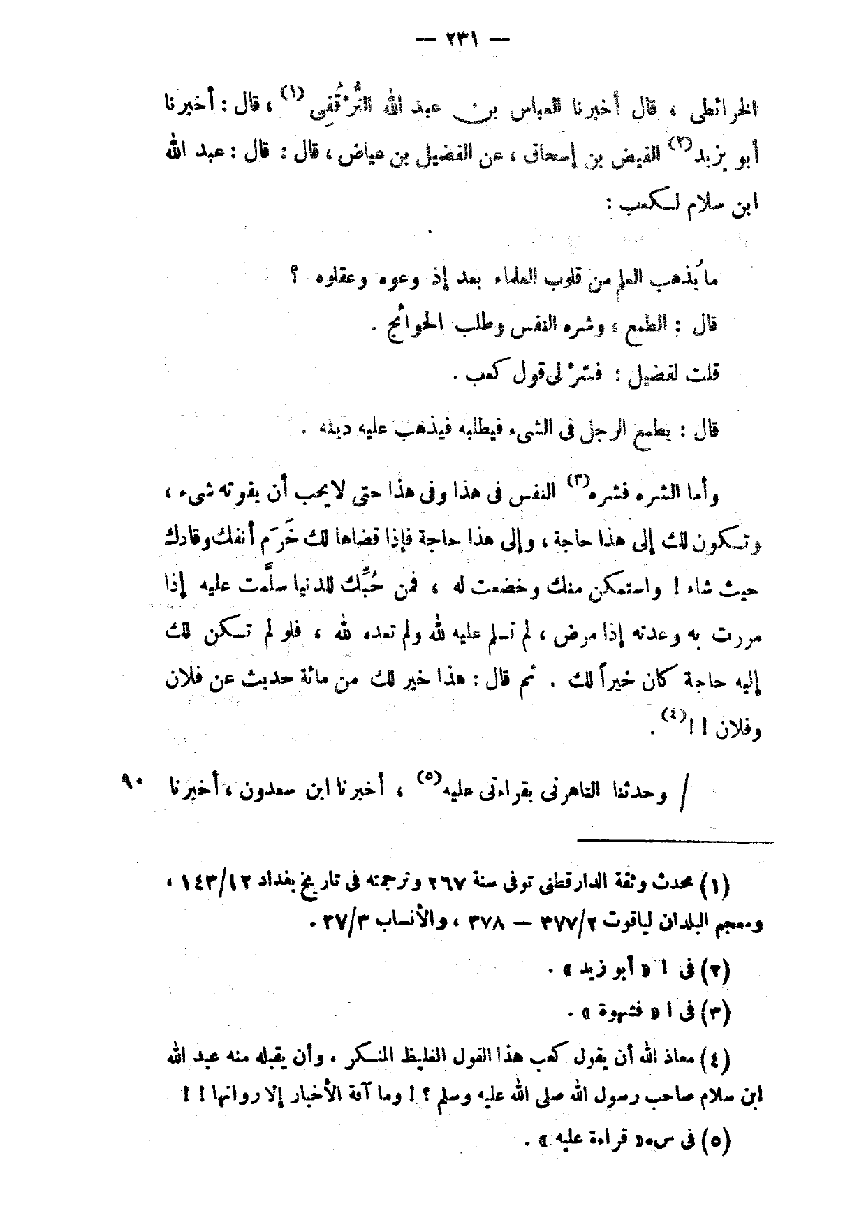 الخرائطي قَالَ أخبرنَا الْعَبَّاس بن عبد الله الترقفى قَالَ أخبرنَا أَبُو يزِيد الْفَيْض بن إِسْحَاق عَن الفضيل بن عِيَاض قَالَ قَالَ عَبْدُ اللَّهِ ابْن سَلَّامٍ لِكَعْبٍ