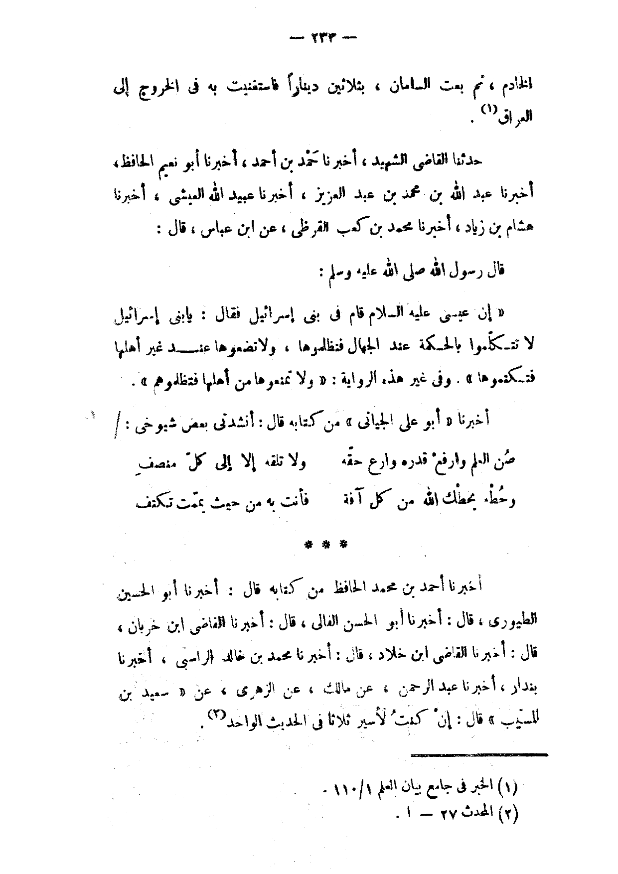 إِنَّ عِيسَى عَلَيْهِ السَّلَامُ قَامَ فِي بَنِي إِسْرَائِيلَ فَقَالَ يَا بَنِي إِسْرَائِيلَ لَا تَتَكَلَّمُوا بِالْحِكْمَةِ عِنْدَ الْجُهَّالِ فَتَظْلِمُوهَا وَلَا تَضَعُوهَا عِنْدَ غَيْرِ أَهْلِهَا فَتَكْتُمُوهَا وَفِي غَيْرِ هَذِهِ الرِّوَايَةِ وَلَا تَمْنَعُوهَا مِنْ أَهْلِهَا فَتَظْلِمُوهُمْ