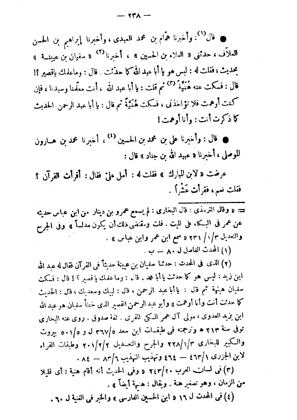 قَالَ وَأَخْبَرَنَا هَمَّامُ بْنُ مُحَمَّدٍ الْعَبْدِيُّ وَأَخْبَرَنَا إِبْرَاهِيمُ بْنُ الْحَسَنِ الْعَلَّافُ حَدَّثَنِي الْعَلَاءُ بْنُ الْحُسَيْنِ أَخْبَرَنَا سُفْيَانُ بْنُ عُيَيْنَةَ بِحَدِيثٍ فَقُلْتُ لَهُ لَيْسَ هُوَ يَا أَبَا عَبْدِ اللَّهِ كَمَا حَدَّثْتَ قَالَ وَمَا عَلَّمَكَ يَا قَصِيرُ قَالَ فَسَكَتَ عَنْهُ هُنَيَّةً ثُمَّ قُلْتُ يَا أَبَا عَبْدِ اللَّهِ أَنْتَ مُعَلِّمُنَا وَسَيِّدُنَا فَإِنْ كُنْتُ أُوهَمْتُ فَلَا تُؤَاخِذَنِي فَسَكَتَ هُنَيَّةً ثُمَّ قَالَ يَا أَبَا عَبْدِ الرَّحْمَنِ الْحَدِيثَ كَمَا ذَكَرْتَ أَنْتَ وَأَنَا أُوهَمْتُ