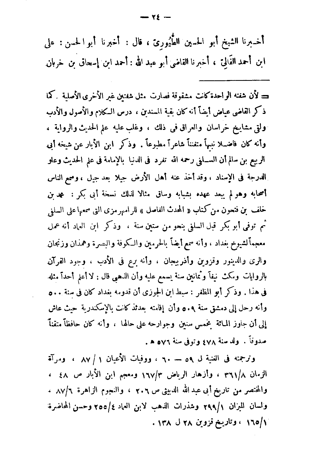 أَخْبَرَنَا الشَّيْخُ أَبُو الْحُسَيْنِ الطُّيُورِيُّ قَالَ أَخْبَرَنَا أَبُو الْحَسَنِ عَلِيُّ ابْن أَحْمَدَ الْفَالِيُّ أَخْبَرَنَا الْقَاضِي أَبُو عَبْدِ اللَّهِ أَحْمَدُ بْنُ إِسْحَاقَ بْنِ خَرْبَانَ