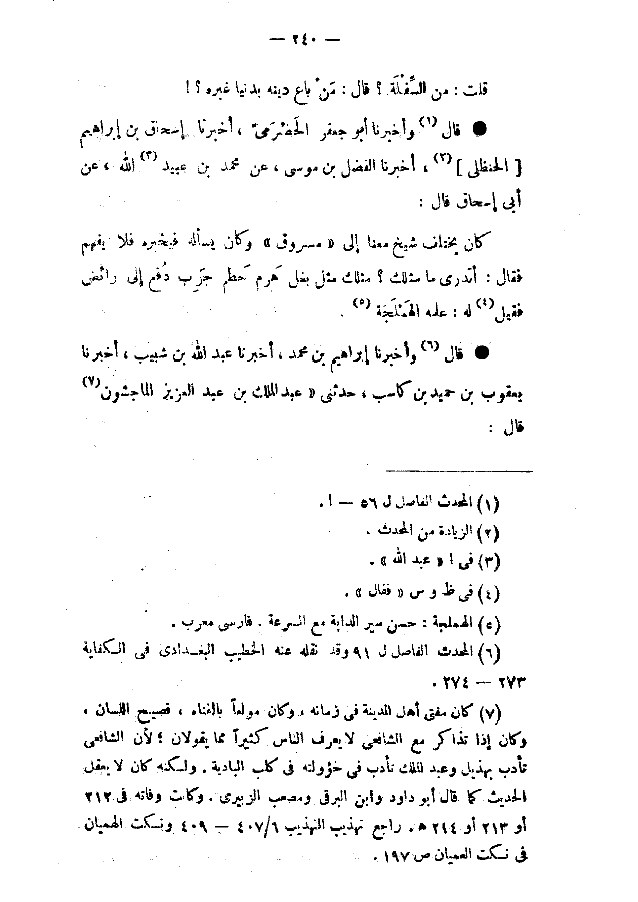 قَالَ وَأَخْبَرَنَا أَبُو جَعْفَرٍ الْحَضْرَمِيُّ أَخْبَرَنَا إِسْحَاقُ بْنُ إِبْرَاهِيمَ الْحَنْظَلِيُّ أَخْبَرَنَا الْفضل بْنُ مُوسَى عَنْ مُحَمَّدِ بْنِ عُبَيْدِ اللَّهِ عَنْ أَبِي إِسْحَاقَ قَالَ
