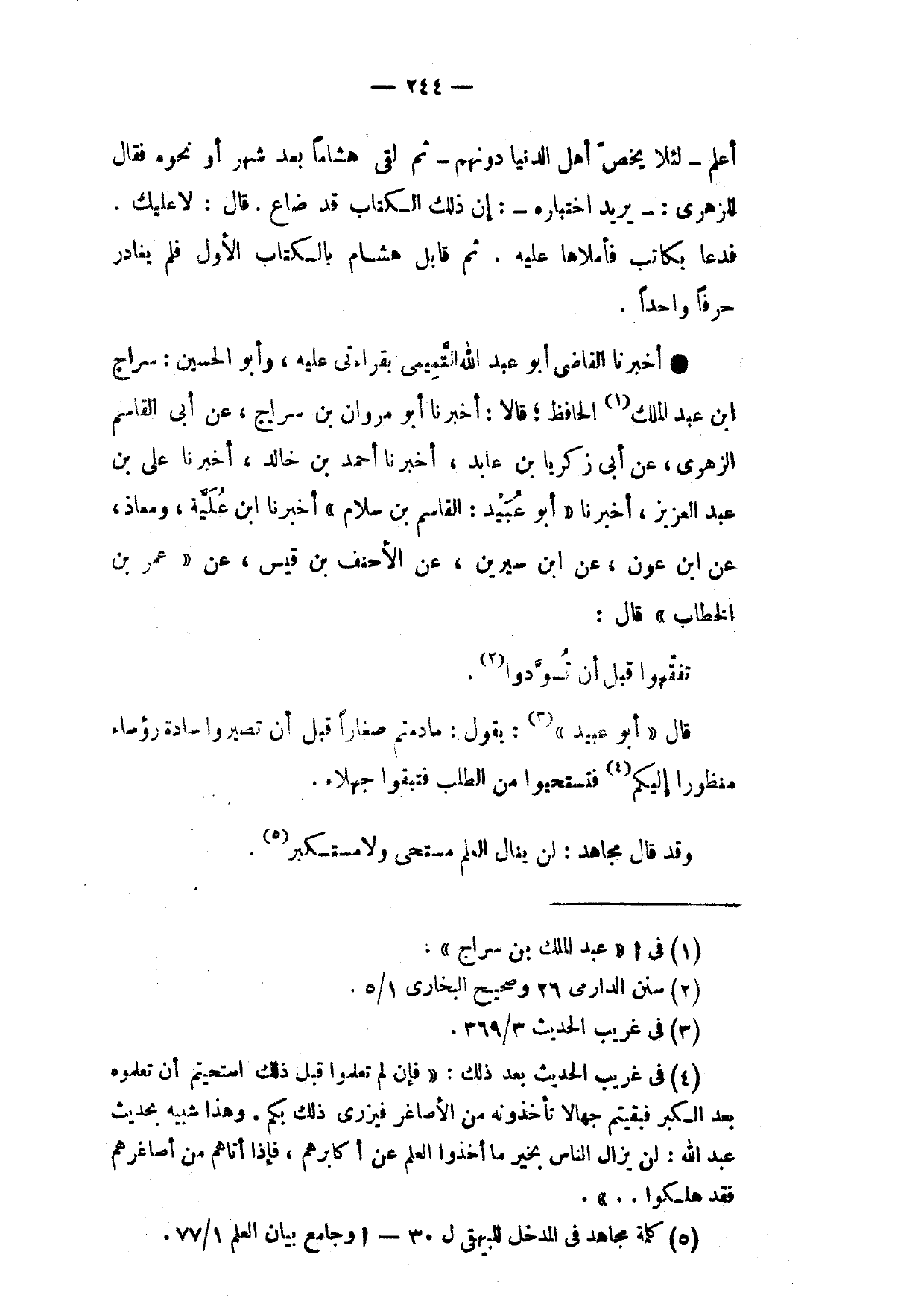 أَخْبَرَنَا الْقَاضِي أَبُو عَبْدِ اللَّهِ التَّمِيمِيُّ بِقِرَاءَتِي عَلَيْهِ وَأَبُو الْحُسَيْن سراج ابْن عَبْدِ الْمَلِكِ الْحَافِظِ قَالَا أَخْبَرَنَا أَبُو مَرْوَانَ بْنُ سِرَاجٍ عَنْ أَبِي الْقَاسِمِ الزُّهْرِيِّ عَنْ أَبِي زَكَرِيَّا بْنِ عَابِدٍ أَخْبَرَنَا أَحْمَدُ بْنُ خَالِدٍ أَخْبَرَنَا عَلِيُّ بْنُ عَبْدِ الْعَزِيزِ أَخْبَرَنَا أَبُو عُبَيْدٍ الْقَاسِمُ بْنُ سَلَّامِ أَخْبَرَنَا ابْنُ عُلَيَّةَ وَمُعَاذٌ عَنِ ابْنِ عَوْنٍ عَنِ ابْنِ سِيرِينَ عَنِ الْأَحْنَفِ بْنِ قَيْسٍ عَنْ عُمَرَ بْنِ الْخَطَّابِ قَالَ