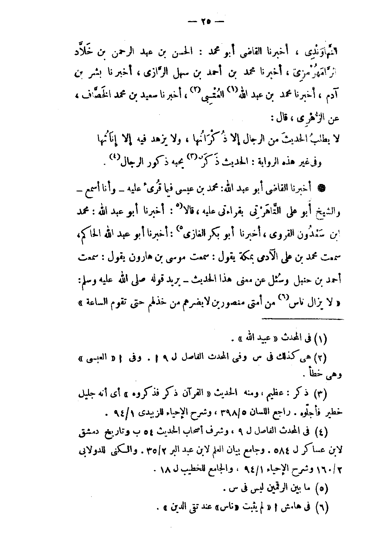أَخْبَرَنَا الْقَاضِي أَبُو عَبْدِ اللَّهِ مُحَمَّدُ بْنُ عِيسَى فِيمَا قرىء عَلَيْهِ وَأَنَا أَسْمَعُ وَالشَّيْخُ أَبُو عَلِيٍّ التَّاهَرْتِيُّ بِقِرَاءَتِي عَلَيْهِ قَالَا أَخْبَرَنَا أَبُو عَبْدِ اللَّهِ مُحَمَّدُ ابْنُ سَعْدُونَ الْقَرَوِيُّ أَخْبَرَنَا أَبُو بكر الغازى أَبُو بَكْرٍ الْغَازِيُّ أَخْبَرَنَا أَبُو عَبْدِ اللَّهِ الْحَاكِمُ سَمِعْتُ مُحَمَّدَ بْنَ عَلِيٍّ الْآدَمِيَّ بِمَكَّةَ يَقُولُ سَمِعْتُ مُوسَى بْنَ هَارُونَ يَقُولُ سَمِعْتُ أَحْمَدَ بْنَ حَنْبَلٍ وَسُئِلَ عَنْ مَعْنَى هَذَا الْحَدِيثِ يُرِيدُ قَوْلَهُ صَلَّى اللَّهُ عَلَيْهِ وَسَلَّمَ لَا يَزَالُ نَاسٌ مِنْ أُمَّتِي مَنْصُورِينَ لَا يَضُرُّهُمْ مَنْ خَذَلَهُمْ حَتَّى تَقُومَ السَّاعَةُ
