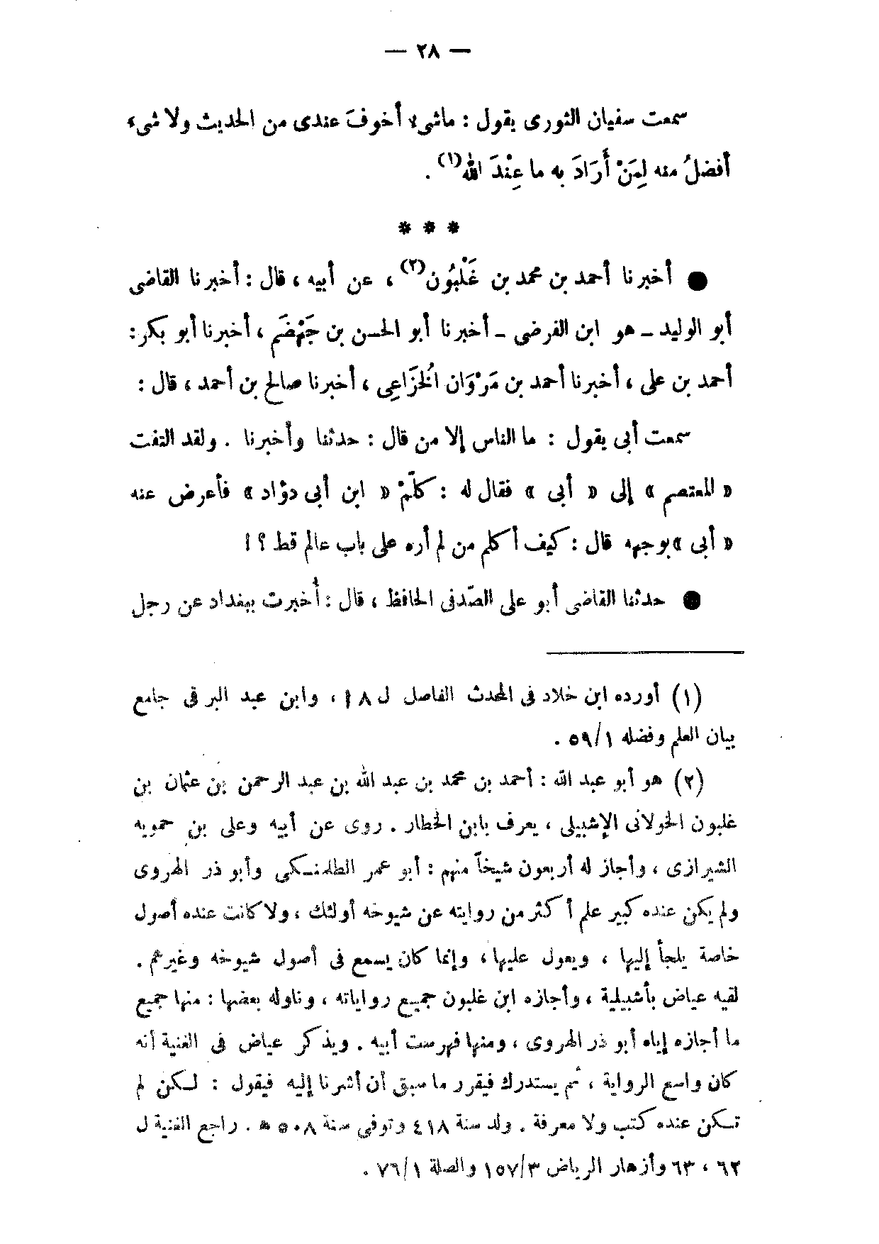 أَخْبَرَنَا أَحْمَدُ بْنُ مُحَمَّدِ بْنِ غَلْبُونٍ عَنْ أَبِيهِ قَالَ أَخْبَرَنَا الْقَاضِي أَبُو الْوَلِيدِ هُوَ ابْنُ الْفَرَضِيِّ أَخْبَرَنَا أَبُو الْحَسَنِ بْنُ جَهْضَمٍ أَخْبَرَنَا أَبُو بَكْرٍ أَحْمَدُ بْنُ عَلِيٍّ أَخْبَرَنَا أَحْمَدُ بْنُ مَرْوَانَ الْخُزَاعِيُّ أَخْبَرَنَا صَالِحُ بْنُ أَحْمَدَ قَالَ